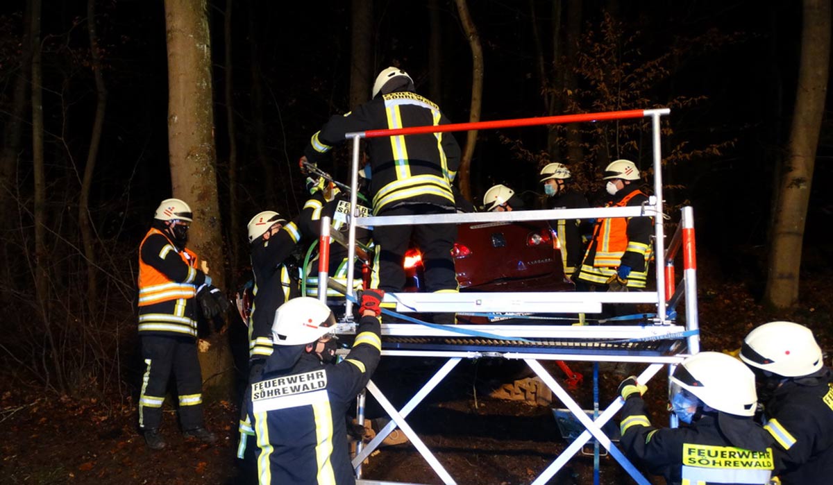 Feuerwehrleute befreiten den lebensgefährlich verletzten Fahrer aus dem Unfallwrack, der, wie die anderen Insassen, in ein Krankenhaus gebracht wurde. Der 14-jährige Beifahrer hatte sich im Schockzustand von der Unfallstelle in zunächst unbekannte Richtung entfernt, konnte aber durch die Einsatzkräfte kurze Zeit später bei Quentel gefunden und zurück zur Unfallstelle gebracht werden.