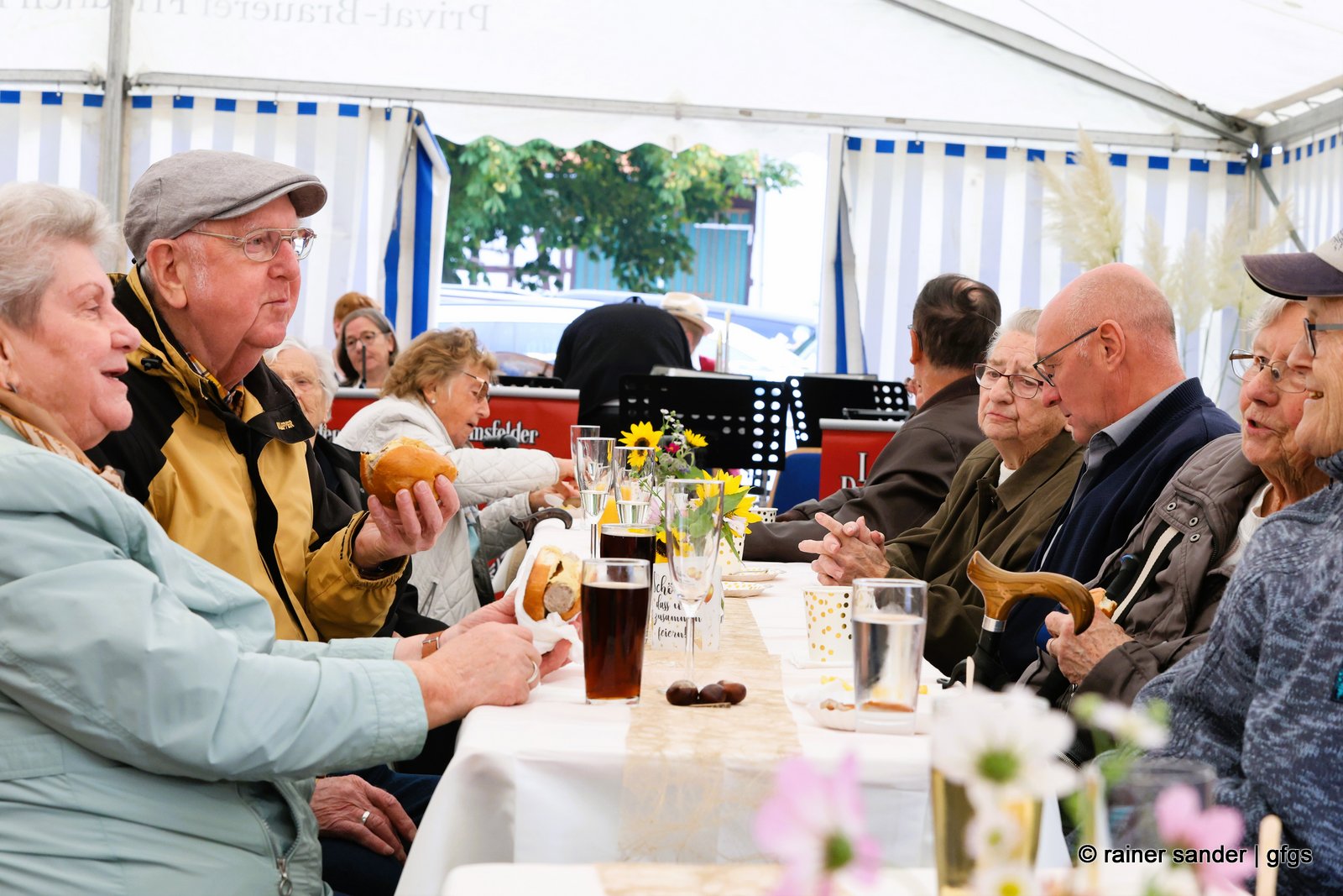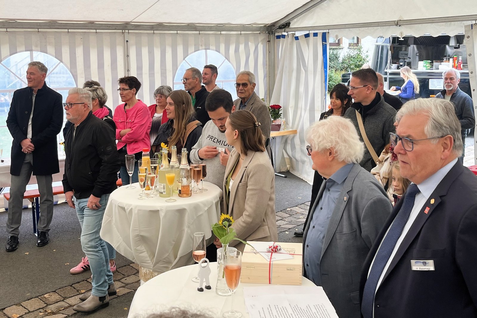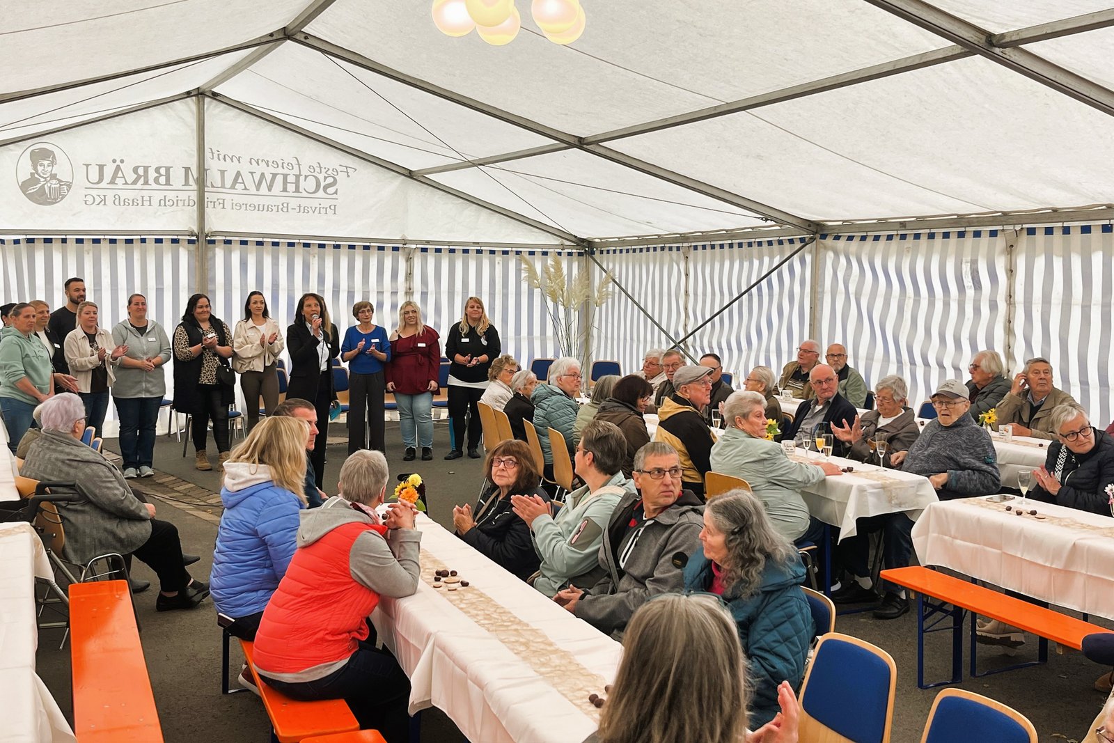 Für die musikalische Umrahmung sorgten die Leimsfelder Dorfmusikanten, und auch die Mitarbeitende des Pflegedienstes hatten eine besondere Überraschung parat: Sie dichteten den bekannten Schlager „Im Wagen vor mir“ um und trugen ihn schwungvoll vor – ein Beitrag, der für viel Heiterkeit und Beifall im Zelt sorgte. Für das leibliche Wohl war mit Kaffee, Kuchen und einem Foodtruck mit Würstchen und Pommes bestens gesorgt.