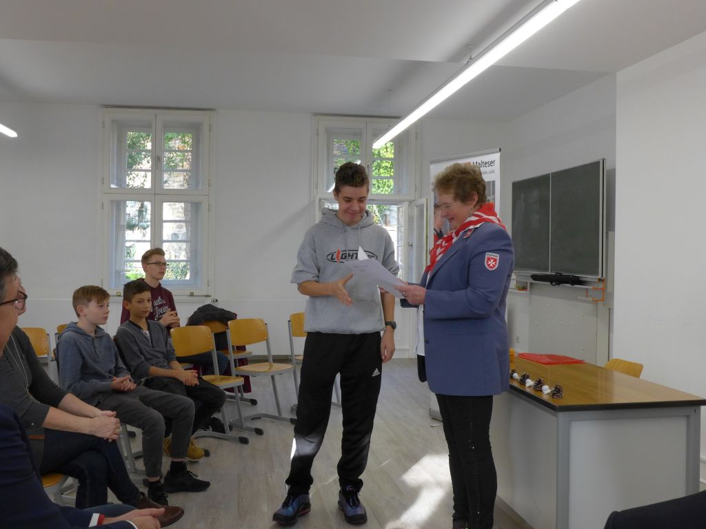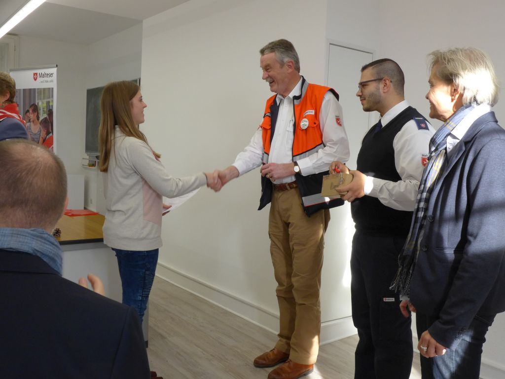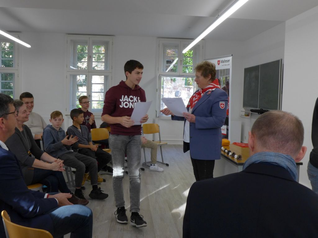 Im Rahmen einer feierlichen Veranstaltung überreichte Brigitta Brähler-Fischer, die als Referentin für den Schulsanitätsdienst der Diözese Fulda die Ausbildungen der Schulsanitäter koordiniert, den 16 Absolventen die Urkunden. Zuvor lobte Schulleiterin Jutta Ramisch das Engagement des Schulsanitätsdienstes an der Ursulinenschule und verwies auf die vielen Veranstaltungen, auf denen die Schulsanitäter präsent sind und erste Hilfe leisten, wenn es erforderlich ist. Zudem bedankte sie sich bei Uwe Heintzemann von der VR PartnerBank, die 500 Euro für die Ausbildung der Schulsanitäter spendete. Dr. Constantin von Brandenstein-Zeppelin, Ehrenpräsident des Malteser Hilfsdienstes, gratulierte den Schulsanitätern zu ihrem erfolgreichen Abschluss der Ausbildung. „Anderen helfen, ist das Schönste auf der Welt! Ihr praktiziert die Nächstenliebe, die Christus uns vorgelebt hat.“ Auch Malteser-Notfallsanitäter Manuel Matthias Lange, der die Ausbildung der Schüler leitete, freute sich für seine Schützlinge.