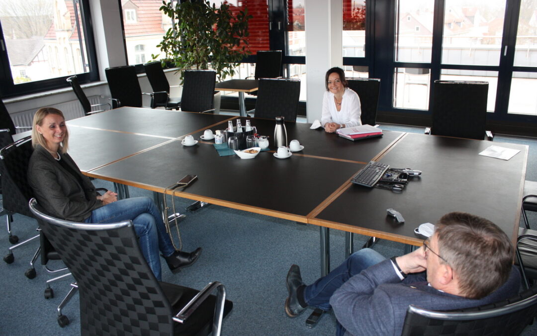 Beitragsfoto: Besprechung im Gudensberger Rathaus (v.l.): Gudensbergs Bürgermeisterin Sina Best lässt sich von Personalsachbearbeiterin Tina Halbig und Niedensteins Bürgermeister Frank Grunewald die Erfahrungen bei der gemeinsamen Personalverwaltung der beiden Kommunen schildern. © Foto: Stadt Gudensberg|nh