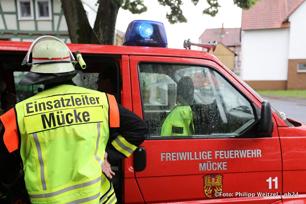Für die Freiwillige Feuerwehr der Gemeinde Mücke wurde aufgrund der Überflutungen in Ober-Ohmen ein Vollalarm ausgelöst, so rückten alle 12 Einsatzabteilungen mit Feuerwehrleuten aus Atzenhain, Bernsfeld, Flensungen, Groß-Eichen, Höckersdorf, Ilsdorf, Merlau, Nieder-Ohmen, Ober-Ohmen, Ruppertenrod, Sellnrod und Wettsaasen zur Hilfe an. Die Zufahrt gestaltete sich aufgrund von überfluteten Landesstraßen schwierig, auf der Straße zwischen Ober-Ohmen und Ruppertenrod schwammen zeitweise mehrere Fässer. Diese waren von einem Produktionsgelände weggeschwemmt worden. Kurzzeitig waren die Schweine eines Bauernhofs in der Ohmstraße vom Ertrinken bedroht, sie konnten jedoch durch Wasserbarrieren geschützt werden. Der Straßenzug der Schillerstraße wurde komplett überflutet. Im Gasthaus am Römer schwammen die Bierfässer im Keller, hier pumpte die Feuerwehr mit einer Tragkraftspritze zeitweise Hunderte Liter Wasser pro Minute ab. In einem Wohnhaus wurde ein Öltank beschädigt, sodass Heizöl ausfloss. Hier rückte die Feuerwehr der Stadt Homberg (Ohm) mit einem Gerätewagen-Gefahrgut zur Hilfe an. Zur Koordination der vielen Einsatzstellen wurde am örtlichen Feuerwehrhaus ein Einsatzleitwagen eingesetzt. „Bei dem Unwetter der letzten Woche waren wir noch verschont geblieben“, so Gemeindebrandinspektor Schlosser vor Ort.