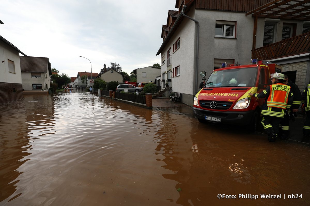 FELDATAL | MÜCKE. Bis zu einen Meter hoch unter Wasser standen am frühen Dienstagabend die Dörfer Ober-Ohmen und Ermenrod im Vogelsbergkreis. Mehr als 150 Feuerwehrleute rückten zur Hilfe aus, um überflutete Wohnhäuser und Straßen vom Wasser zu befreien. In Ober-Ohmen rettete die Feuerwehr eine Seniorin aus ihrer überfluteten Wohnung.