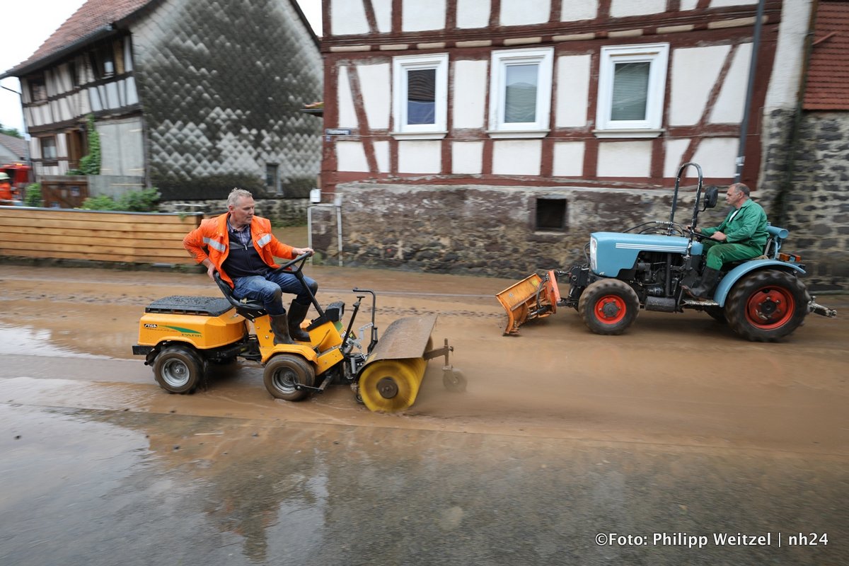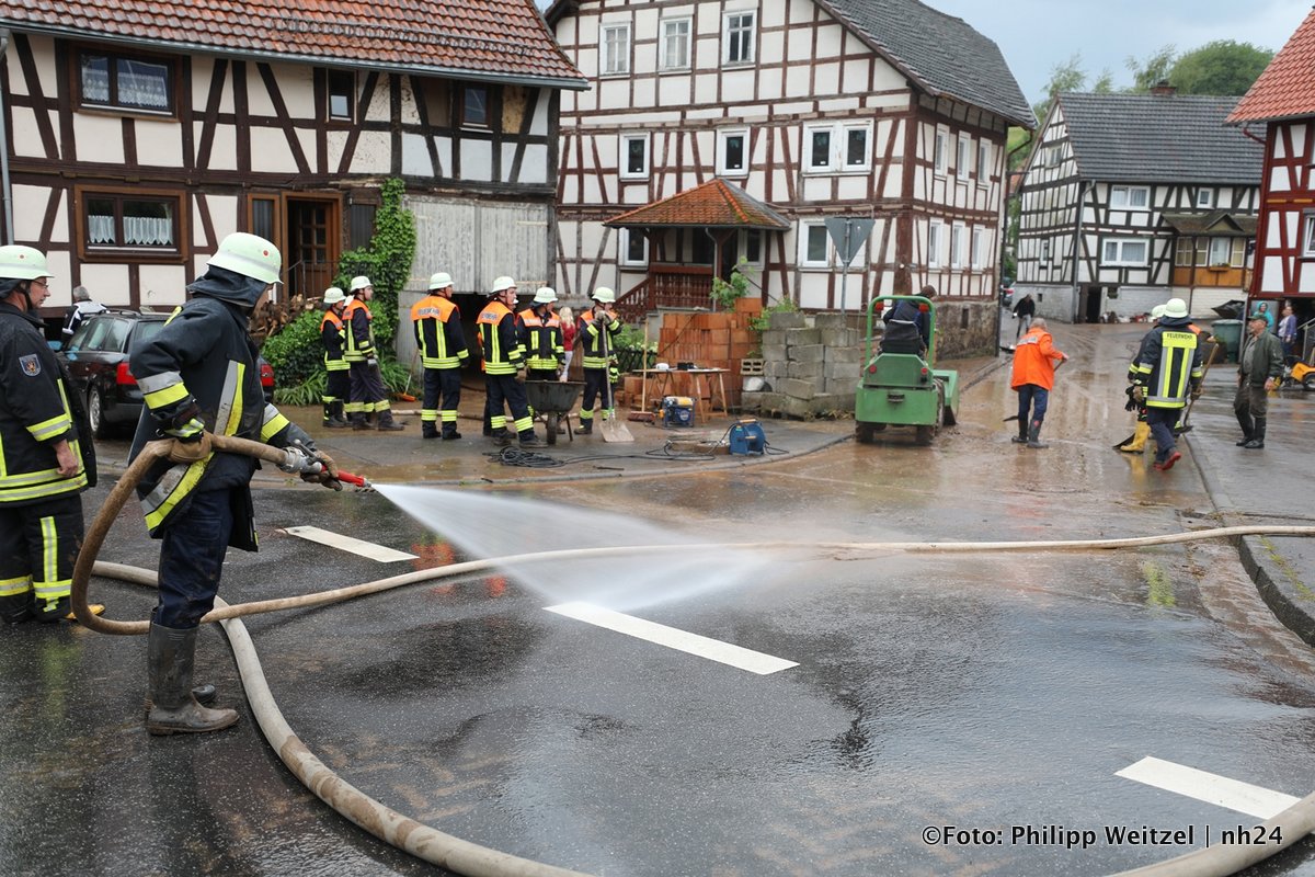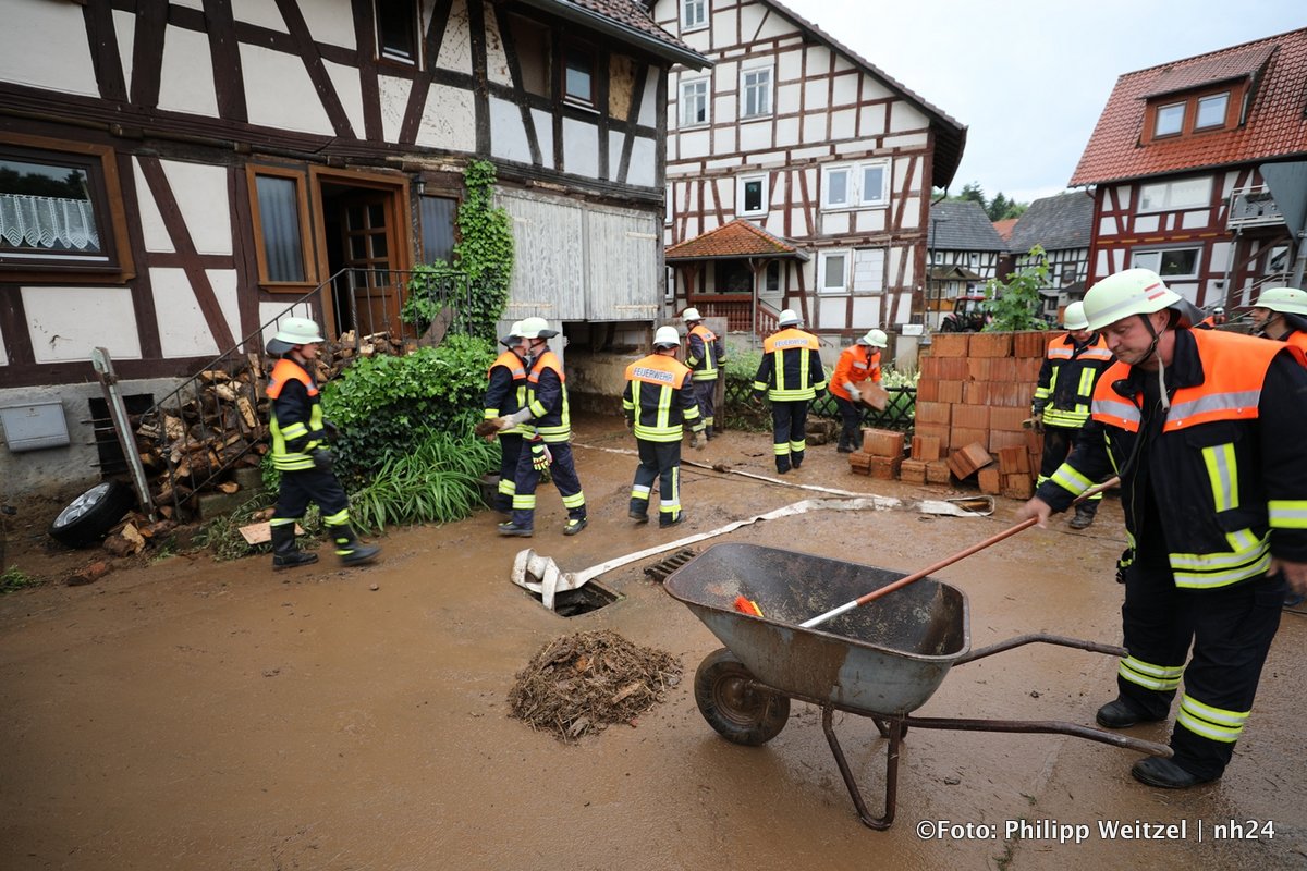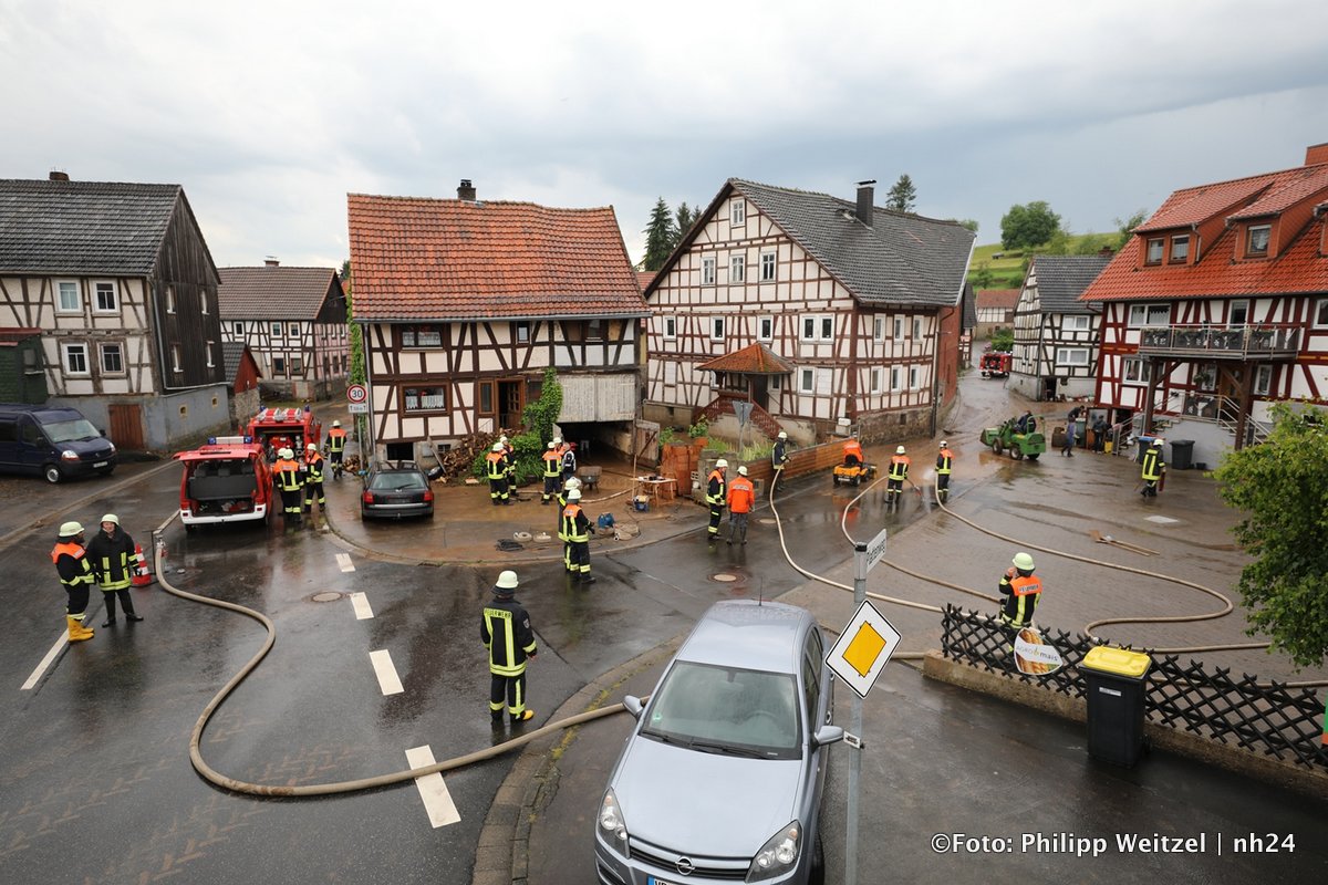 „Das Wasser stand ihr sprichwörtlich bis zum Hals“, so Mückes Gemeindebrandinspektor Martin Schlosser. In Ermenrod musste die Bundesstraße 49 wegen einer Schlammüberflutung gesperrt werden. „Wir wurden erst wegen einem vollgelaufenen Keller zur Hilfe gerufen, bei unserem Eintreffen stand dann Ermenrod unter Wasser“, so Feldatals Gemeindebrandinspektor Rüdiger Klaus. Auch betroffen war Ruppertenrod, hier musste die Feuerwehr einige Keller leer pumpen.