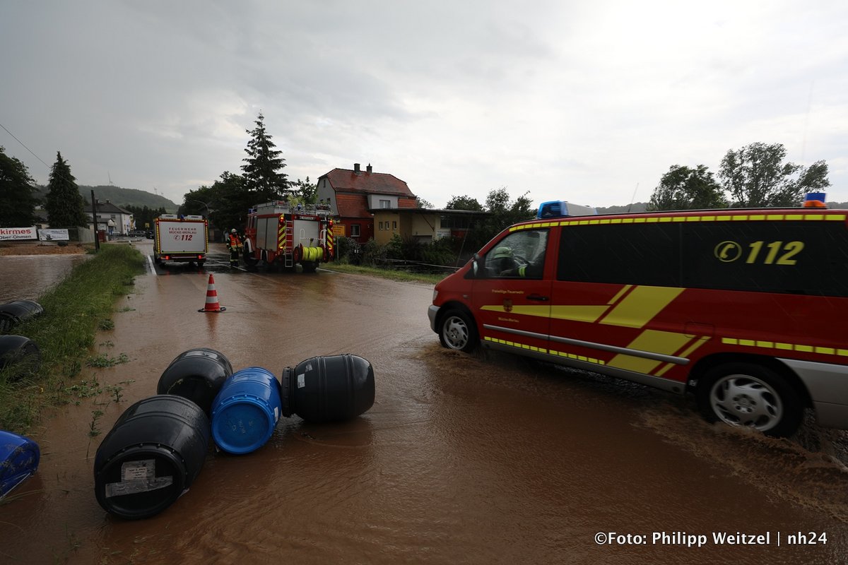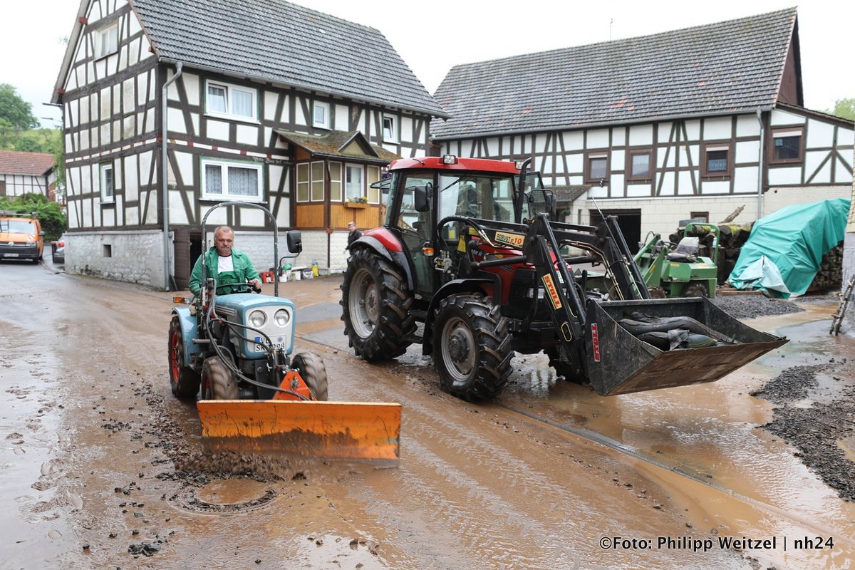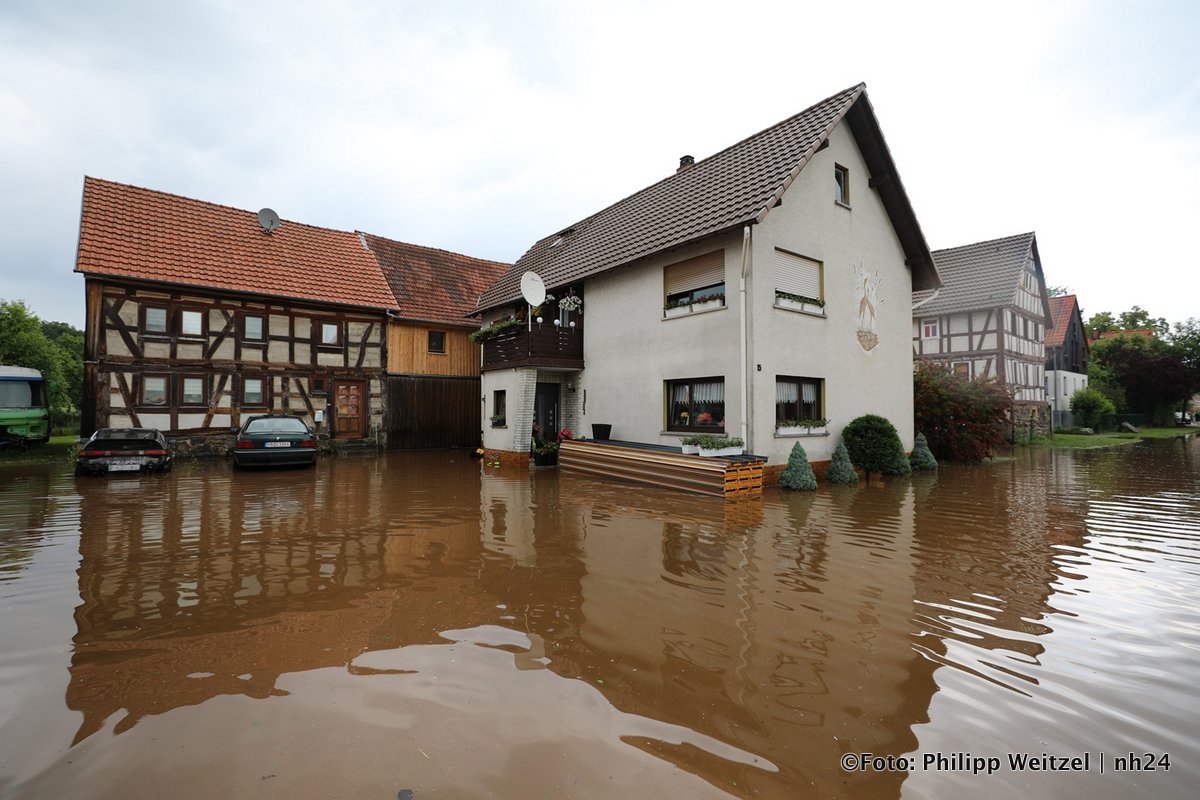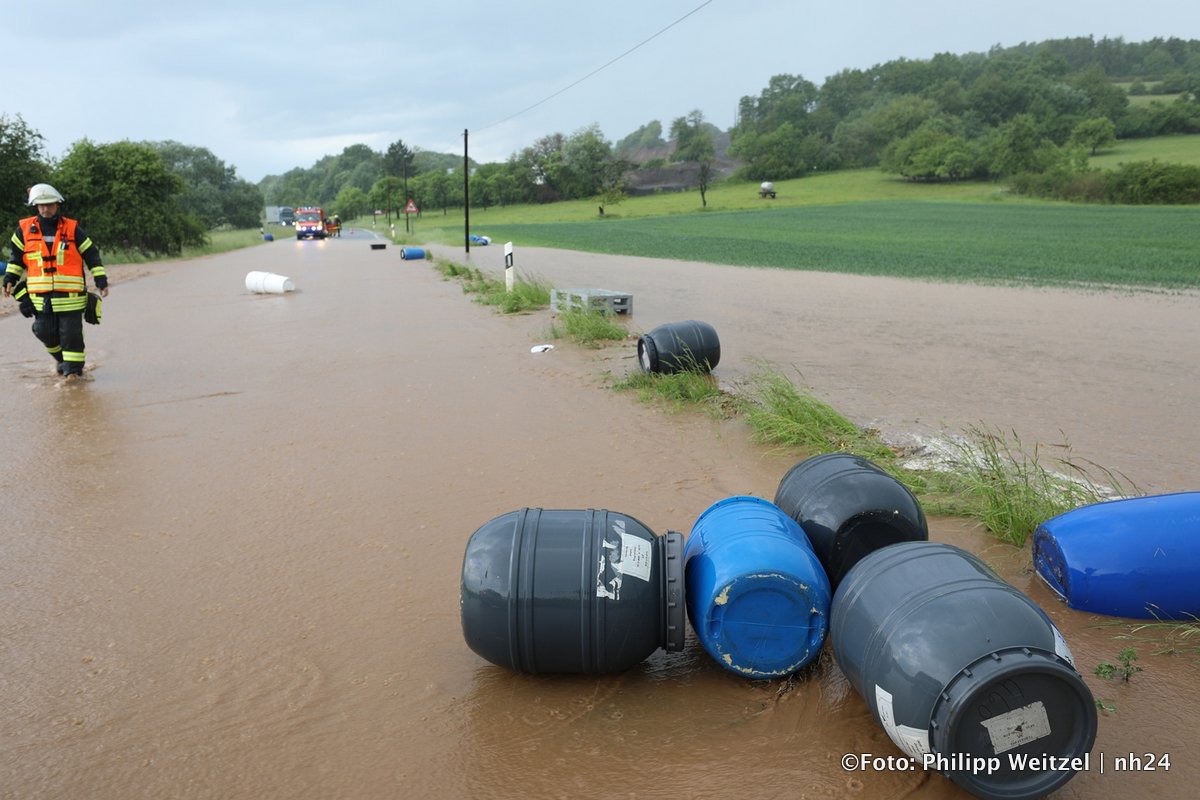 „Das Wasser stand ihr sprichwörtlich bis zum Hals“, so Mückes Gemeindebrandinspektor Martin Schlosser. In Ermenrod musste die Bundesstraße 49 wegen einer Schlammüberflutung gesperrt werden. „Wir wurden erst wegen einem vollgelaufenen Keller zur Hilfe gerufen, bei unserem Eintreffen stand dann Ermenrod unter Wasser“, so Feldatals Gemeindebrandinspektor Rüdiger Klaus. Auch betroffen war Ruppertenrod, hier musste die Feuerwehr einige Keller leer pumpen.