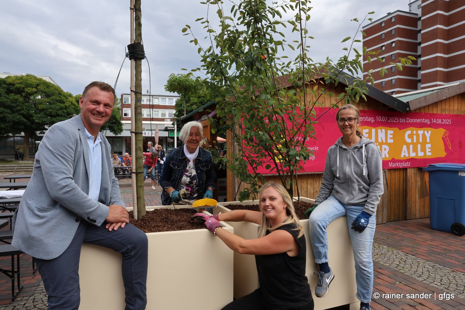 „Eine City für alle“ lautet das Motto für sechs Veranstaltungen auf dem Marktplatz. Gepflanzt wurden Amber, Felsenbirne und Hainbuche, also „Klimabäume“. Wann immer es sinnvoll ist, können die Bäume wandern. Der städtische Bauhof kann die Kübel jederzeit verschieben und neu platzieren. Immer dorthin, wo bei einem Fest, Markt oder kulturellen Veranstaltung Schatten gebraucht wird.