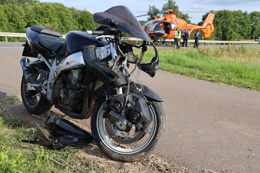 Der Sozius wurde durch den Aufprall mehrere Meter hinter die Schutzplanke ins Feld geschleudert und erlitt Verletzungen. Er wurde mit einem Rettungshubschrauber in ein Klinikum geflogen. Angaben zum Schweregrad liegen noch nicht vor. Der Fahrer wurde ebenfalls verletzt und in ein Krankenhaus gebracht.
