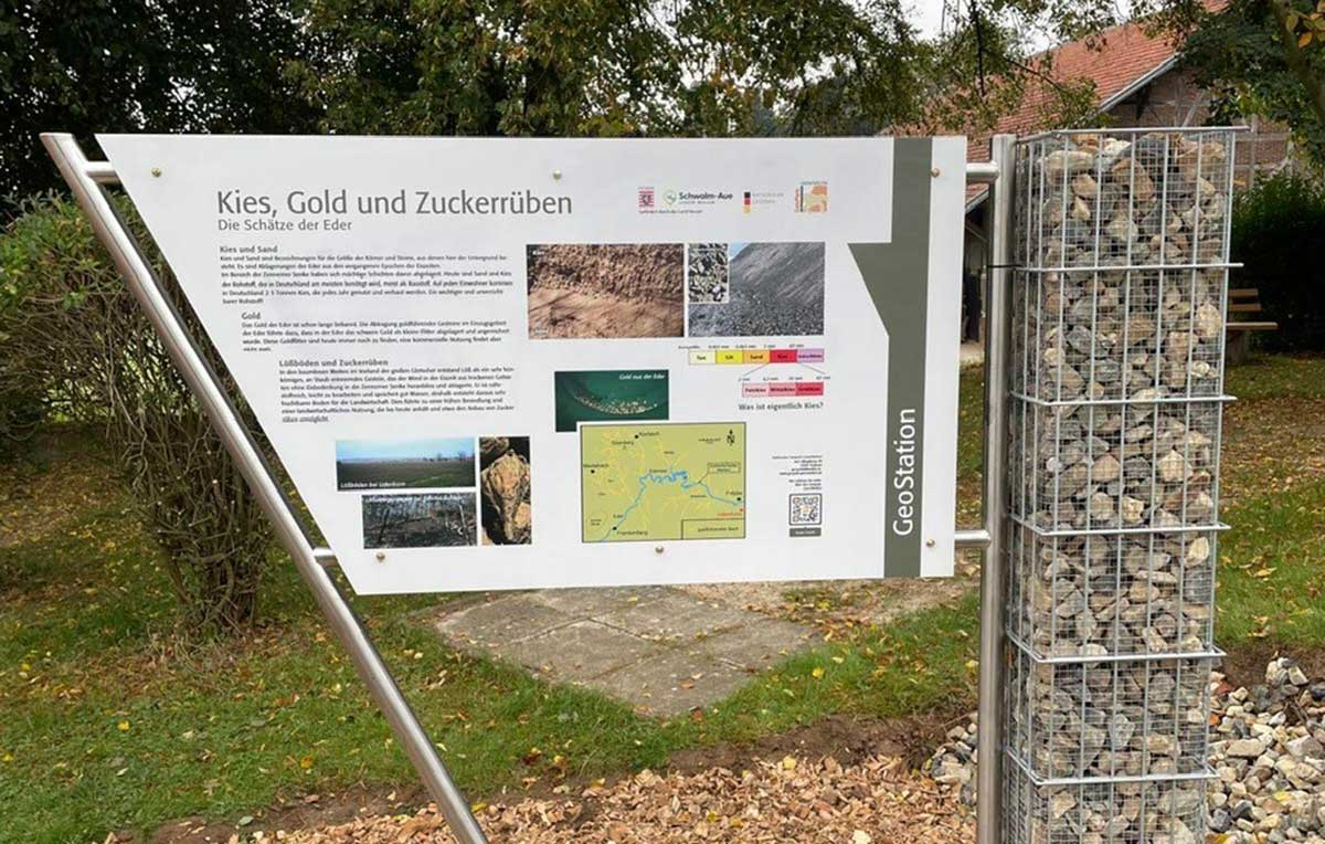 WABERN-UDENBORN. Am Picknickplatz in Udenborn wurde eine neue Geostation des Geoparks GrenzWelten eröffnet. Die moderne Informationstafel erklärt die eiszeitlich geprägte Landschaft, die regionalen Kiesvorkommen an der Eder sowie deren Bedeutung für die Region. Eine Gabione neben der Tafel ist mit Kies aus Udenborn gefüllt, bereitgestellt von der Firma Irma Oppermann.