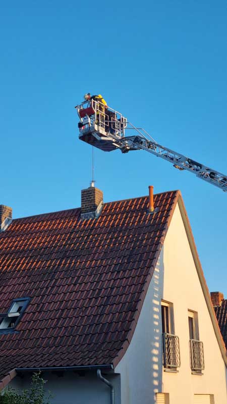 Ein hinzugerufener Schornsteinfeger kehrte den Schornstein anschließend über die Drehleiter. Verletzt wurde niemand. Nach Abschluss der Arbeiten übergaben die Einsatzkräfte die Einsatzstelle an den Schornsteinfeger und die Bewohner. Insgesamt waren rund 40 Feuerwehrkräfte beteiligt.
