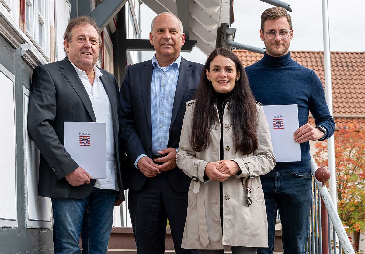 Lothar Maurer, Erster Beigeordneter der Gemeinde Oberaula, Innenminister Roman Poseck, Jonas Korell, Bürgermeister der Gemeinde Ottrau, und Landtagsabgeordnete Christin Ziegler (v.l.n.r.) (wal)