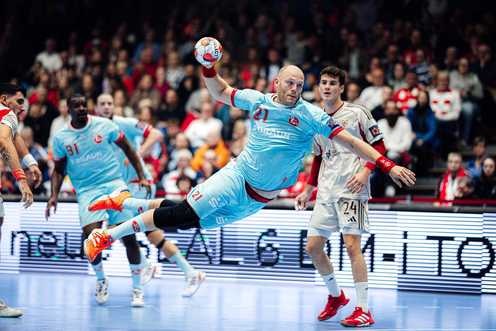 Nach einem ausgeglichenen Beginn stabilisierte sich die MT-Defensive, und ein Doppelpack von Arnar Freyr Arnarsson sorgte fĂĽr die erste Vier-Tore-FĂĽhrung (9:5). Benfica reagierte mit einem siebten Feldspieler und verkĂĽrzte bis zur Pause auf 14:12.