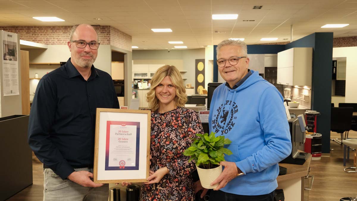 SCHWALMSTADT | NÜRNBERG. Seit zwei Jahrzehnten verbindet den Nürnberger Kaffeevollautomaten-Hersteller Nivona und electroplus küchenplus Plag in Schwalmstadt eine erfolgreiche Partnerschaft. Zum 20-jährigen Jubiläum dankte Nivona-Vertriebsmitarbeiter Stefan Grunewald dem Fachhändler mit einer Urkunde, überreicht an Beraterin Laura Bundt und Inhaber Frank Draxler – und startete zugleich die attraktive Rabattaktion Alt gegen Neu.