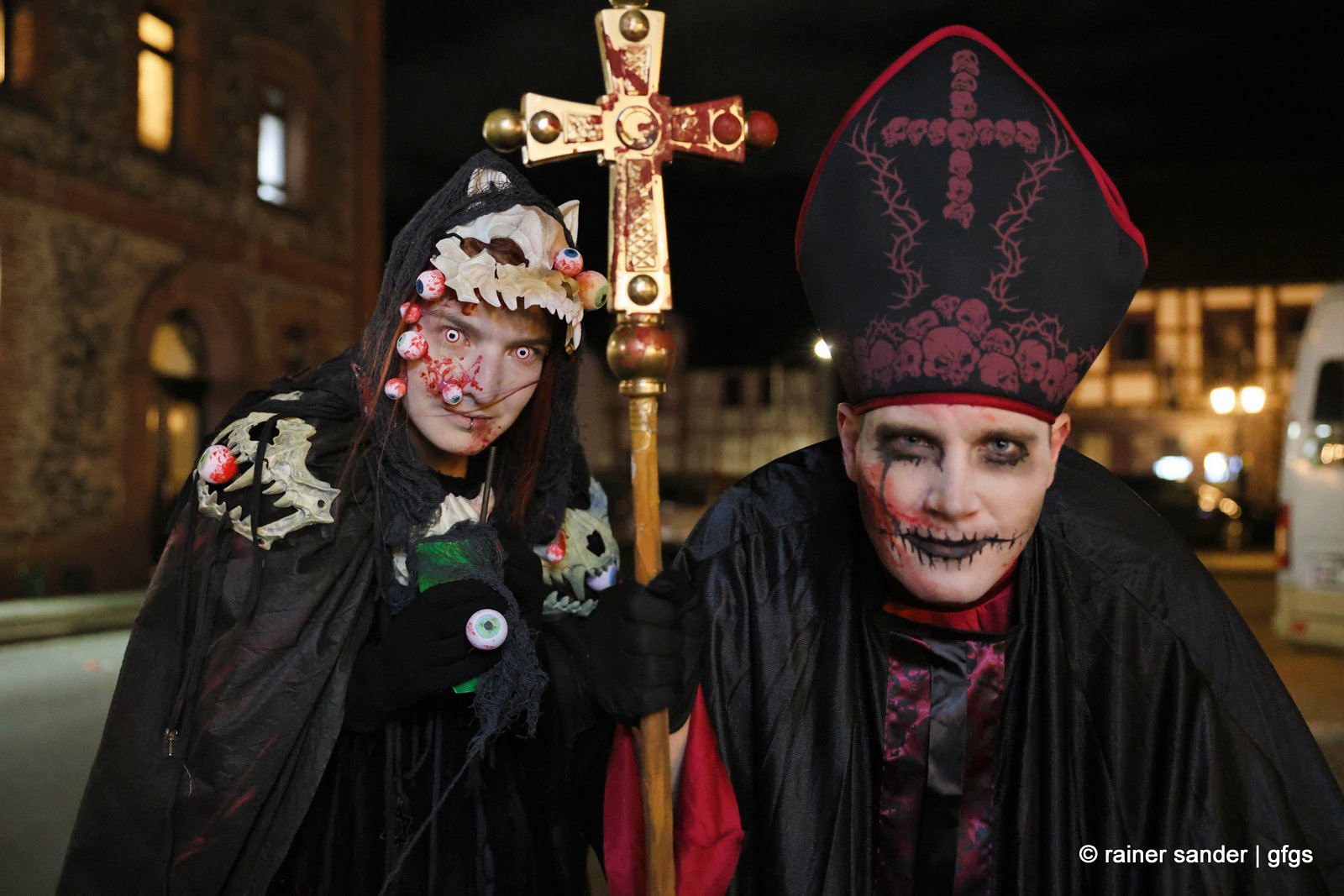 Stattdessen „schwebte“ ein großer Grusel-Engel über der Menschenmenge und ein „wilder“ Dinosaurier mischte sich unter die Gruselgestalten. Sooo alt ist der Brauch zwar nicht, aber das ursprünglich irisch-keltisch Fest, als es noch Samhain hieß und die Tore zur Anderswelt (dem Jenseits) öffnete, ist zumindest älter als alle christlichen Bräuche und Feste; und es ist im Gegensatz dazu in Europa geboren. Nein, nicht in Amerika! Das war nur das Land von March-Mellows und Cola … Nichts von Bedeutung. Was die Kirche dazu sagt? In Irland hat sie nie etwas dazu gesagt, weil alle Druiden Pfarrer geworden waren, und in Borken war die Kirchengemeinde stets gerne mit dabei. Man kennt ja seine kleinen Teufel und Sünder sowieso. Mit oder ohne Verkleidung … Und es war Reformationstag … (rs)