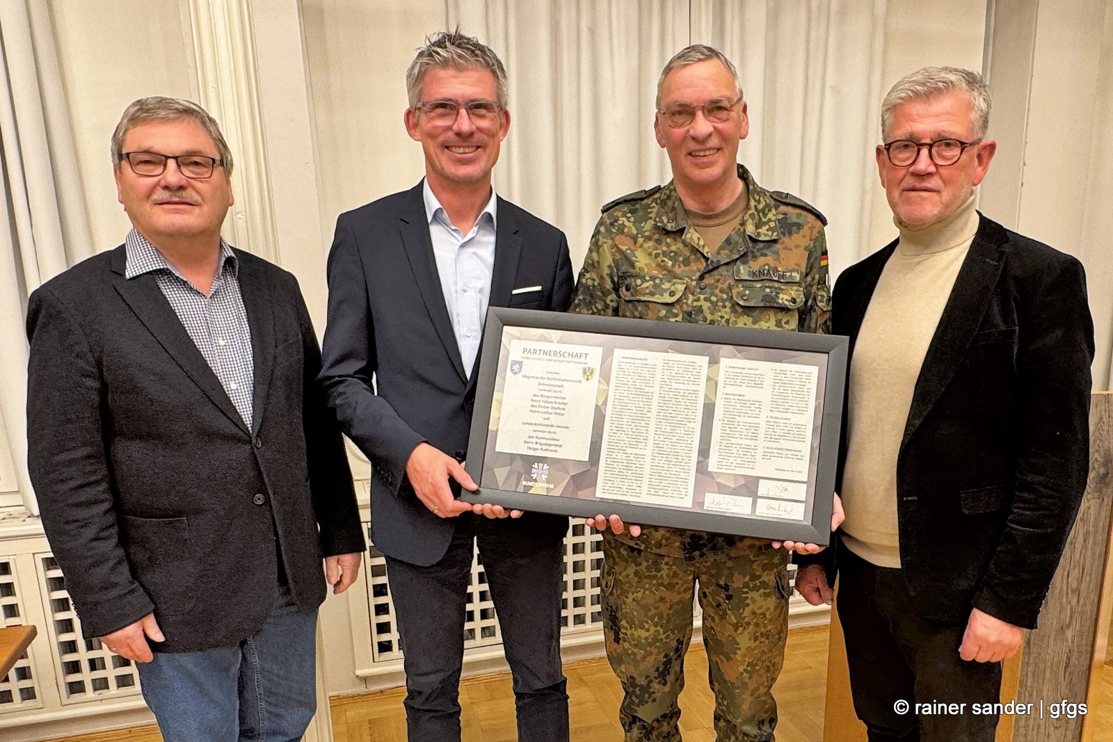 Stadtverordnetenvorsteher Reinhard Otto (CDU), Bürgermeister Tobias Kreuter, Oberstleutnant Horst Knauff, Erster Stadtrat Lothar Ditter (SPD) © Foto: Rainer Sander