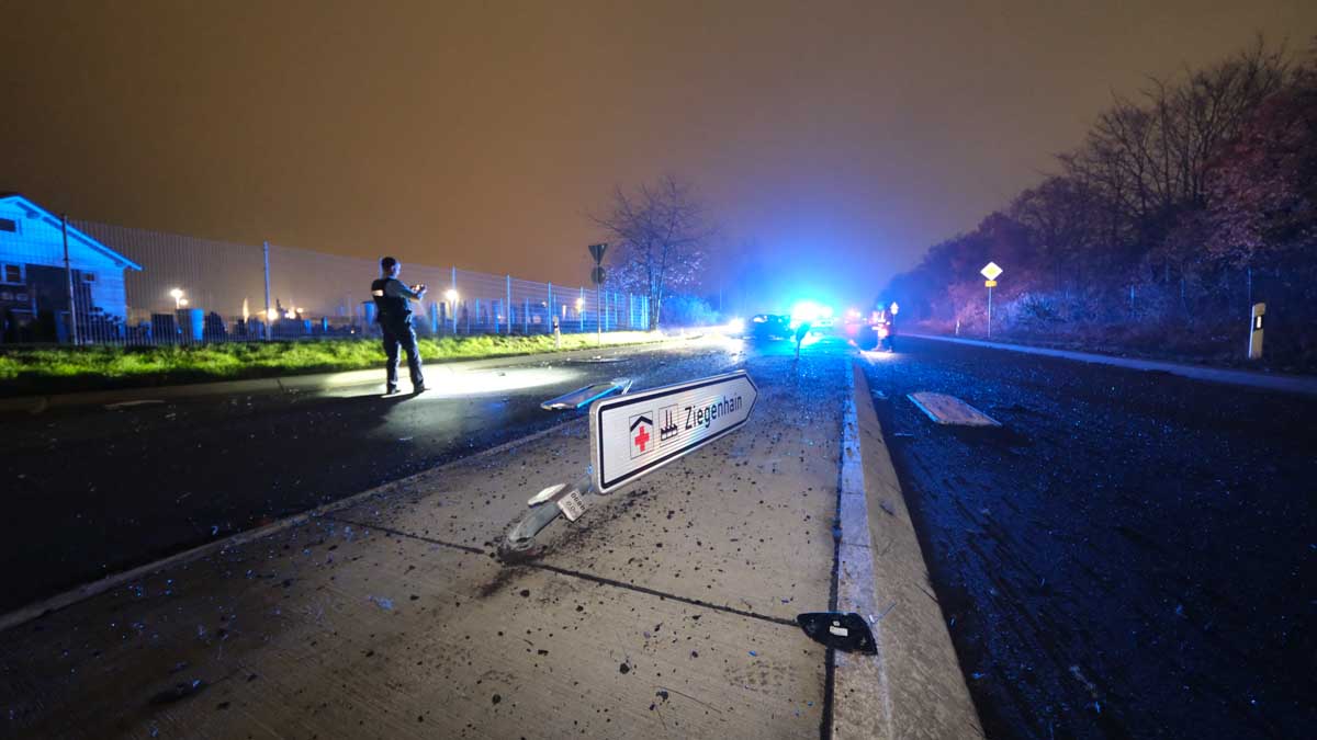 Nach Polizeiangaben fuhr der Mann gegen 3:50 Uhr mutmaßlich ungebremst und mit hoher Geschwindigkeit zunächst über die Verkehrsinsel in Höhe der Firma Heidelmann. Der anschließende Kreisel wirkte wie ein Katapult: Das Fahrzeug hob ab und schleuderte über die Fahrbahn. Im weiteren Verlauf zerstörte der BMW mehrere Verkehrsschilder auf der gegenüberliegenden Insel, hinterließ tiefe Abdrücke der Felgen im Asphalt, überschlug sich und kam schließlich auf den Rädern zum Stillstand. Trümmerteile verteilten sich auf der Fahrbahn und bis über den Zaun eines Grabmal-Zentrums.