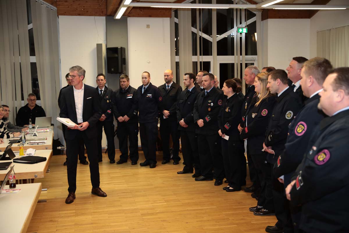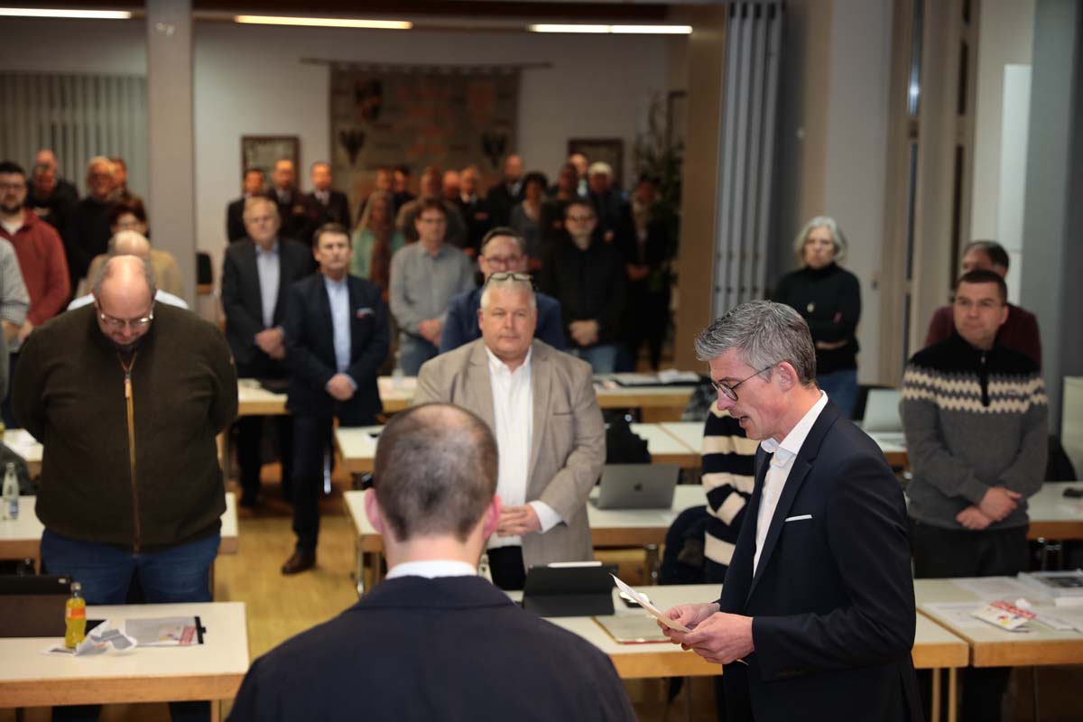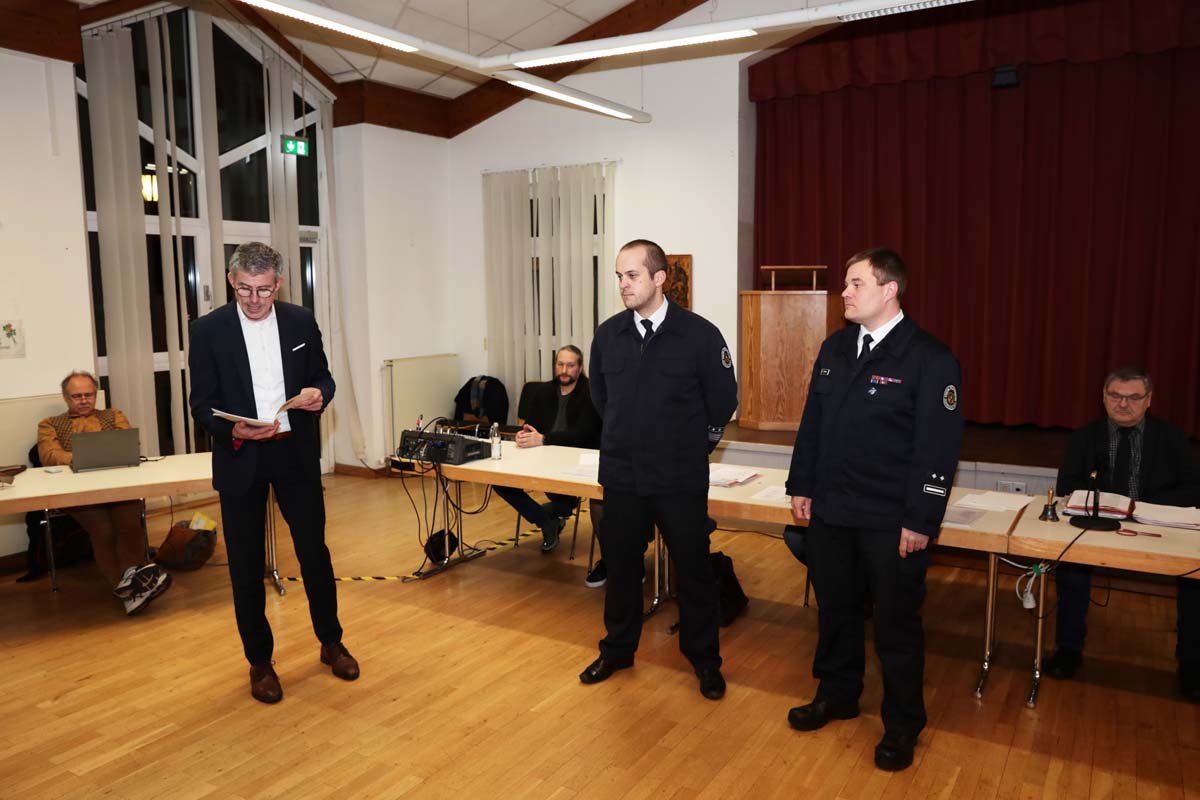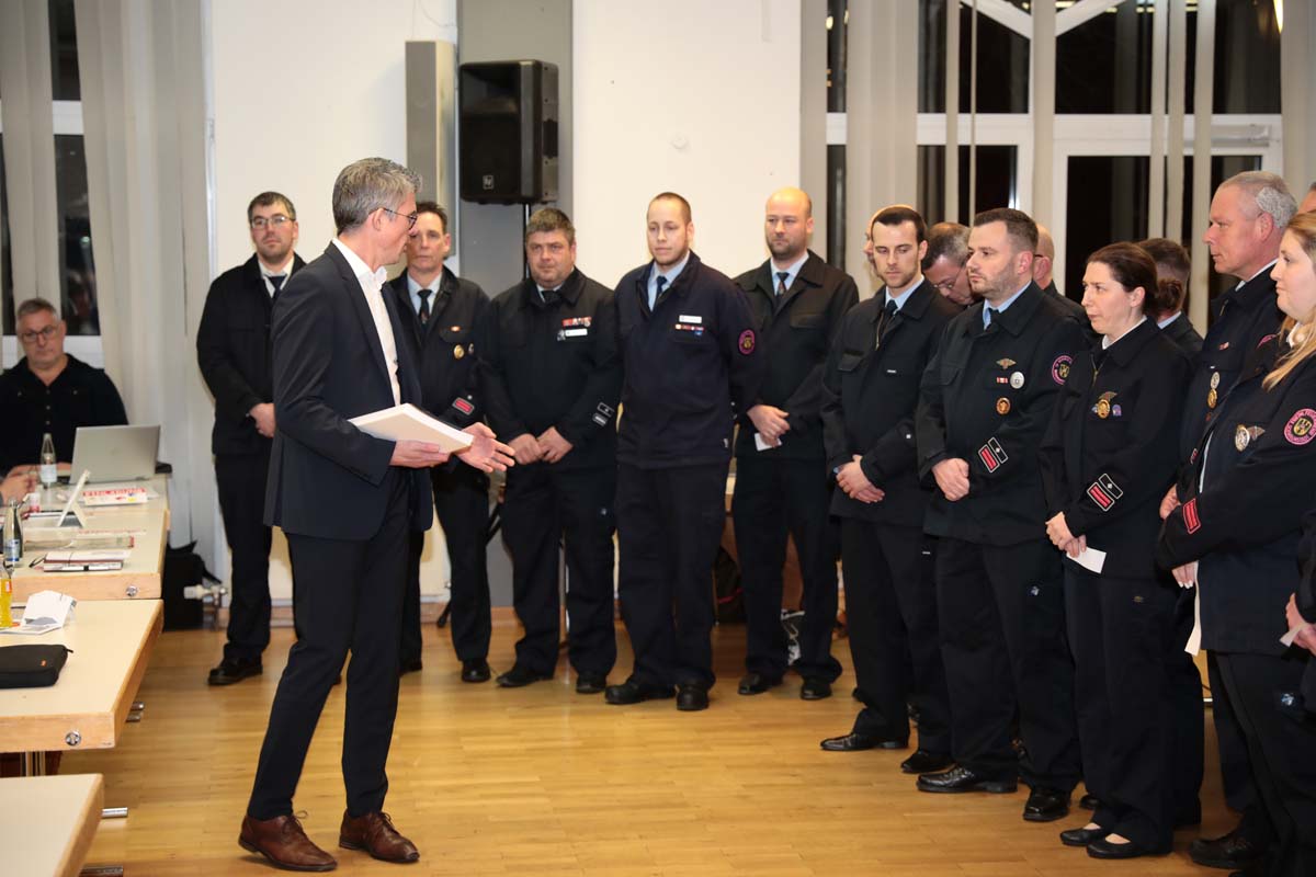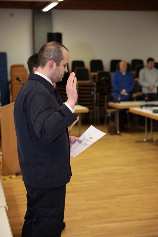 Vor dem Abarbeiten der Tagesordnung für die Sitzung der Stadtverordnetenversammlung am Donnerstag wurden sie ernannt und als Ehrenbeamte gemäß § 12 Abs. 6 des Hessischen Gesetzes über den Brandschutz, die Allgemeine Hilfe und den Katastrophenschutz (HBKG) vereidigt durch Bürgermeister Tobias Kreuter. Sie müssen, so der Bürgermeister, bereit sein, jederzeit für die Freiheitlich Demokratische Grundordnung einzutreten, den Diensteid oder die Verpflichtung leisteten sie auf das Grundgesetz der Bundesrepublik Deutschland und die Verfassung des Landes Hessen. Der Wert und die Stellung der Feuerwehr kamen in jeder Geste, mit jedem Wort und jeder Betonung zur Geltung. Tobias Kreuter wurde nicht müde, jede Urkunde – und vor allem, wer sie unterzeichnet hat – zu verlesen.