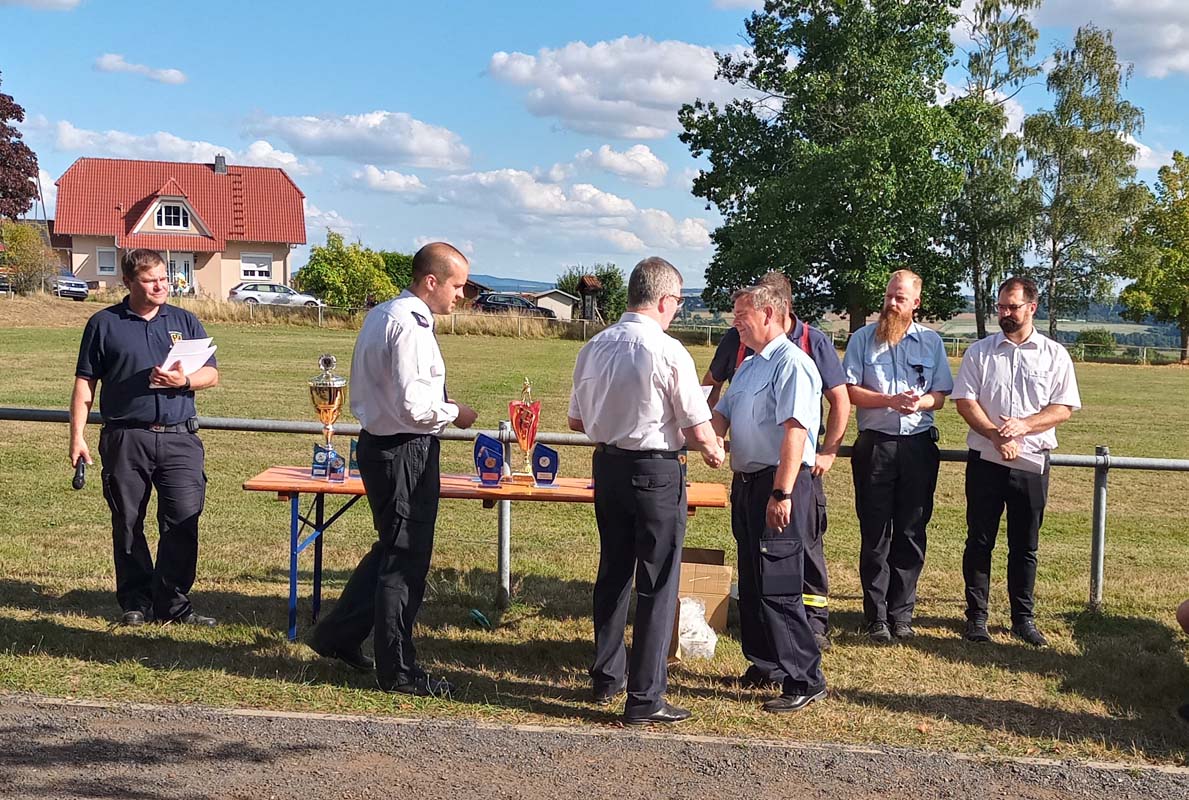 Stadtbrandinspektor Tim Köhler überbrachte Glückwünsche im Namen der Kreisbrandinspektorin Tanja Dittmar, von Bürgermeister Tobias Kreuter und den städtischen Gremien. Er hob die gute Vorbereitung und Organisation des Stadtpokals hervor und begrüßte besonders die Mitglieder der Ehren- und Altersabteilungen.