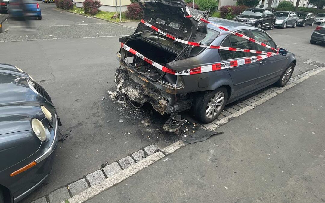 KASSEL-WESERTOR. In der Nacht zum Samstag ist in der Schäfergasse in Kassel ein geparkter BMW in Brand geraten. Ein Taxifahrer bemerkte das Feuer gegen 3:50 Uhr und alarmierte umgehend die Feuerwehr. Der Brand, der im Heckbereich des älteren, blauen 3er-BMW ausgebrochen war, konnte zwar schnell gelöscht werden, dennoch entstand Totalschaden am Fahrzeug.