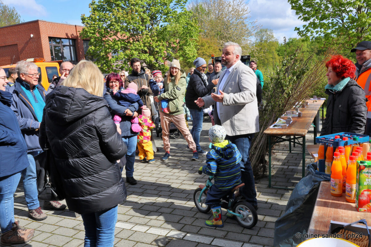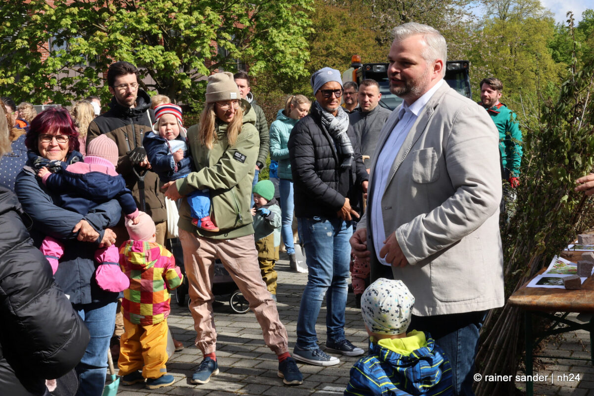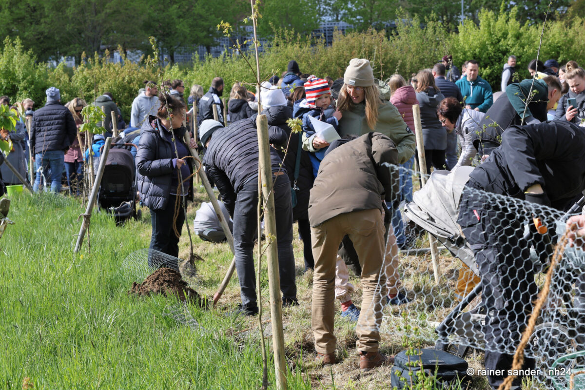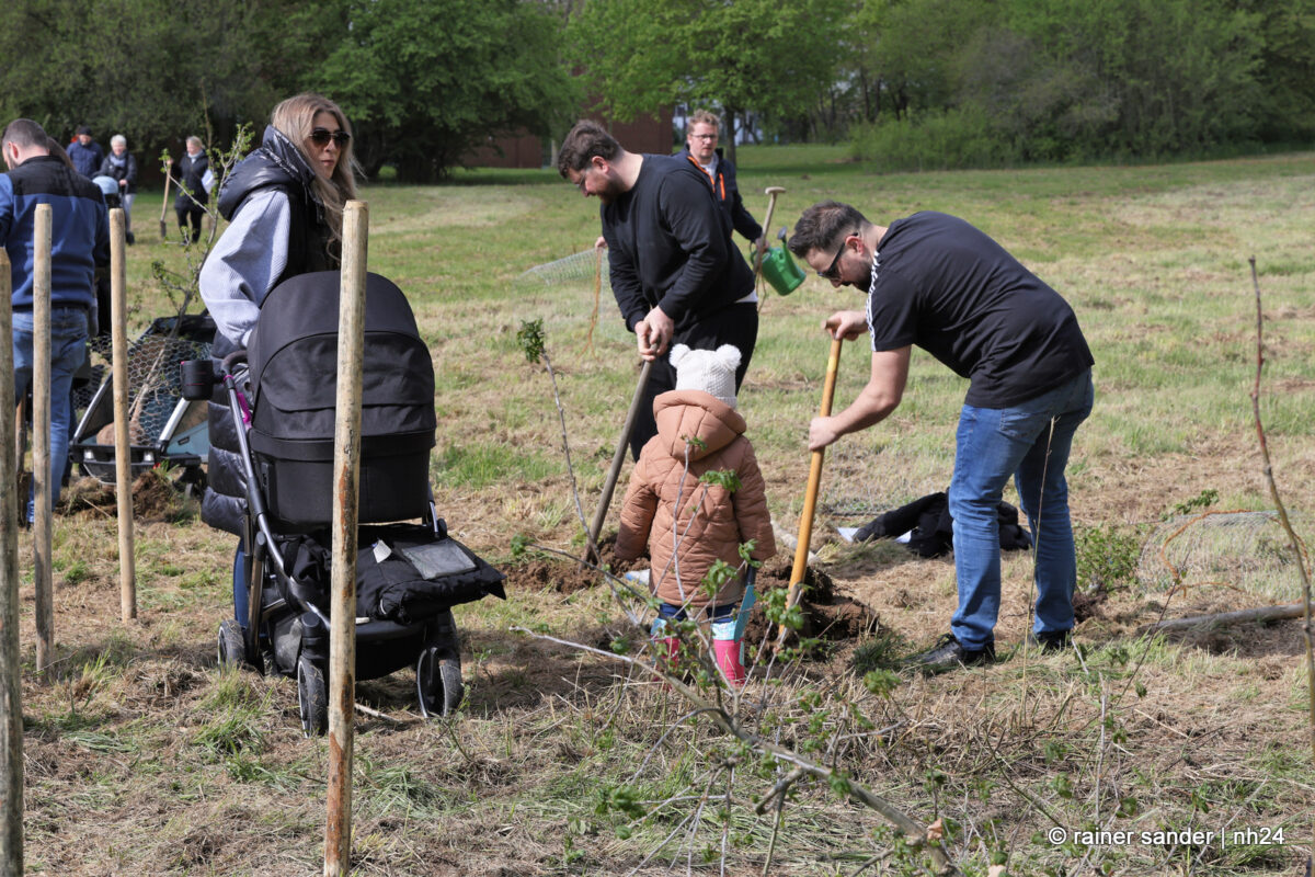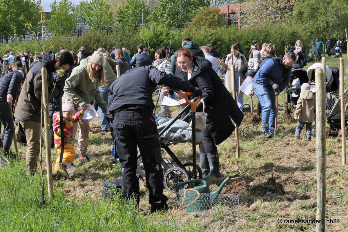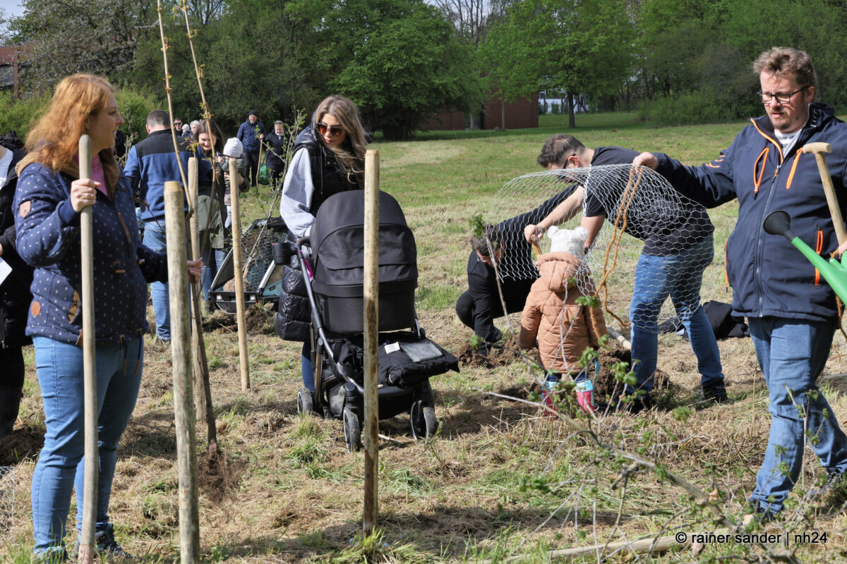Die Kinder waren da, Apfelbäume gab es diesmal nicht. Aber der Weltuntergang steht auch nicht an. Dafür standen Arten zur Auswahl, die dabei helfen, die Biodiversität in der Volkswagen-Stadt zu fördern: Hainbuche, Spitzahorn, Vogelkirsche und Traubeneiche hatte der Bauhof diesmal besorgt, und die Familien konnten sich das passende Bäumchen selbst aussuchen. Die für den Gartenbau zuständigen Mitarbeiter des Bauhofs, Regina Braunewell und Tobias Kirchhof erklärten, wie sinnvoll und sicher gepflanzt wird. Die Mamas, Papas, Großeltern und Geschwister konnten sich selbst einen Platz aussuchen und an bereits eingeschlagenen Pfählen mit vereinten Kräften ein Loch graben, Draht zum Schutz gegen Mäuse einlegen und schließlich die Bäumchen in die Erde pflanzen.