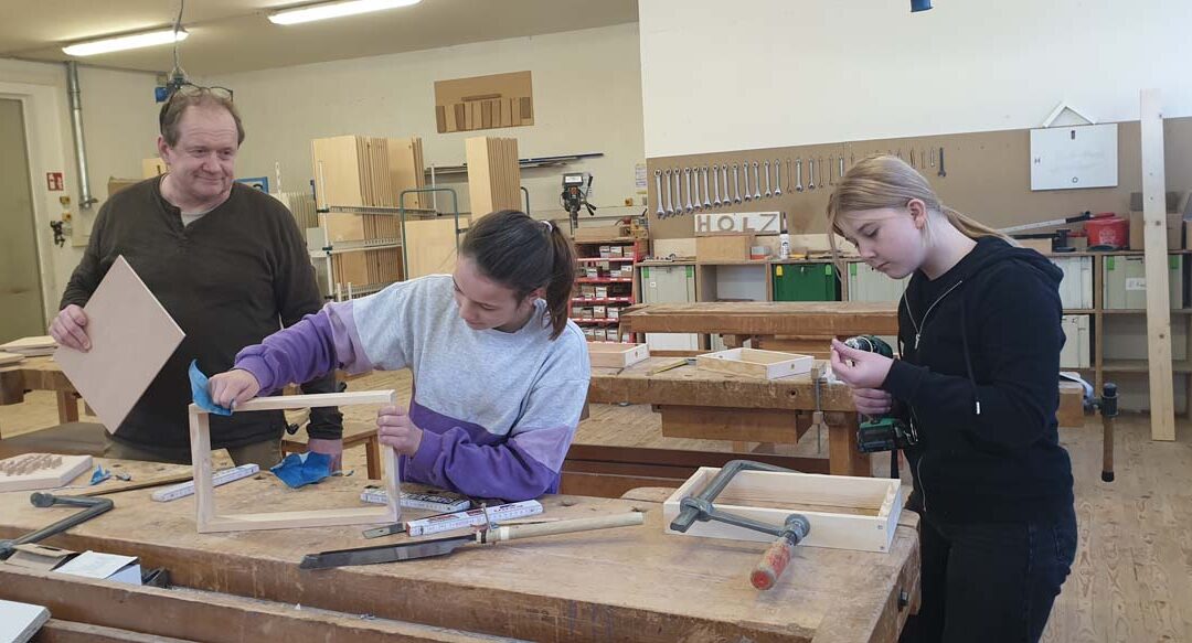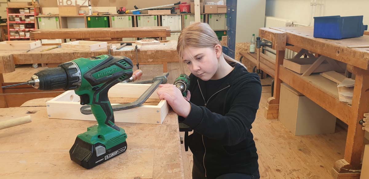 „Es ist sehr cool, man kann sehr viel selbst machen und lernt viel Neues“, so die 13-jährige Feline-Jolie Simon. Ein Solitär-Spiel und ein Tablett aus Buchenholz baut sie an diesem Vormittag, was sie auch mit nach Hause nehmen darf.