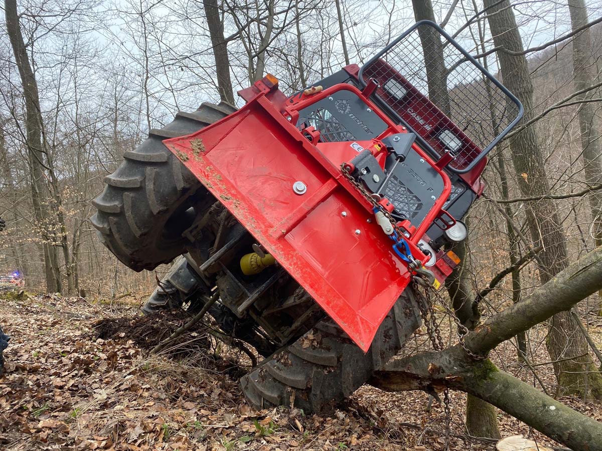 Die selbständige Fahrt des Traktors wurde rund 120 Meter unterhalb der Einsatzstelle durch kleinere Bäume beendet. In kippender Position kam das Fahrzeug zwar zum Stillstand, drohte aber weiter den Hang hinunterzustürzen.