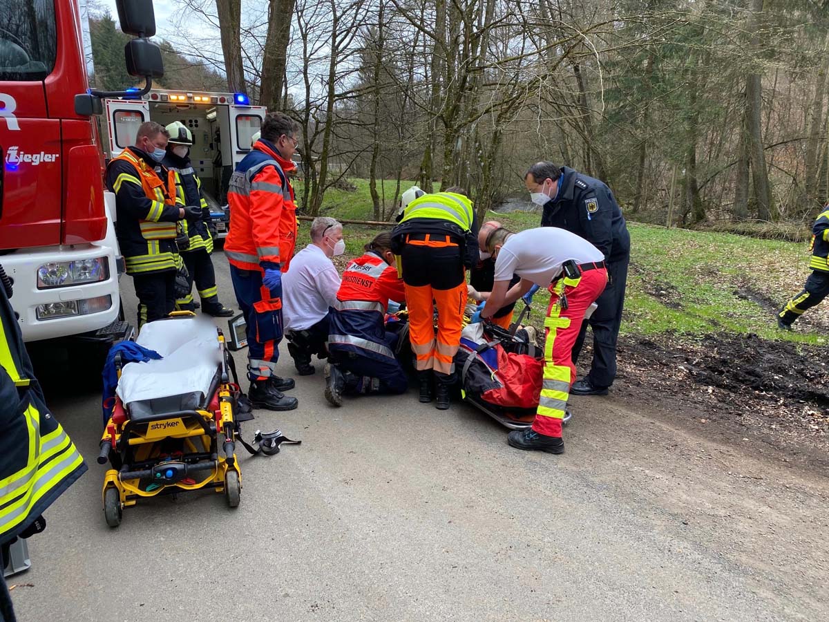 Ein Passant hatte den Schwerverletzten auf einem Waldweg, einige hundert Meter von der Kreisstraße entfernt gefunden und Hilfe alarmiert.