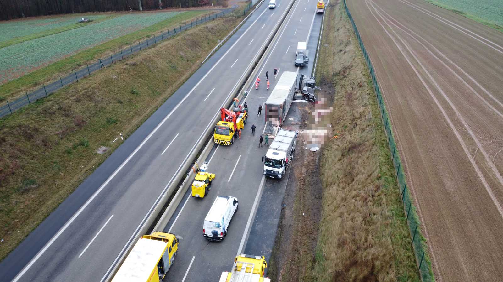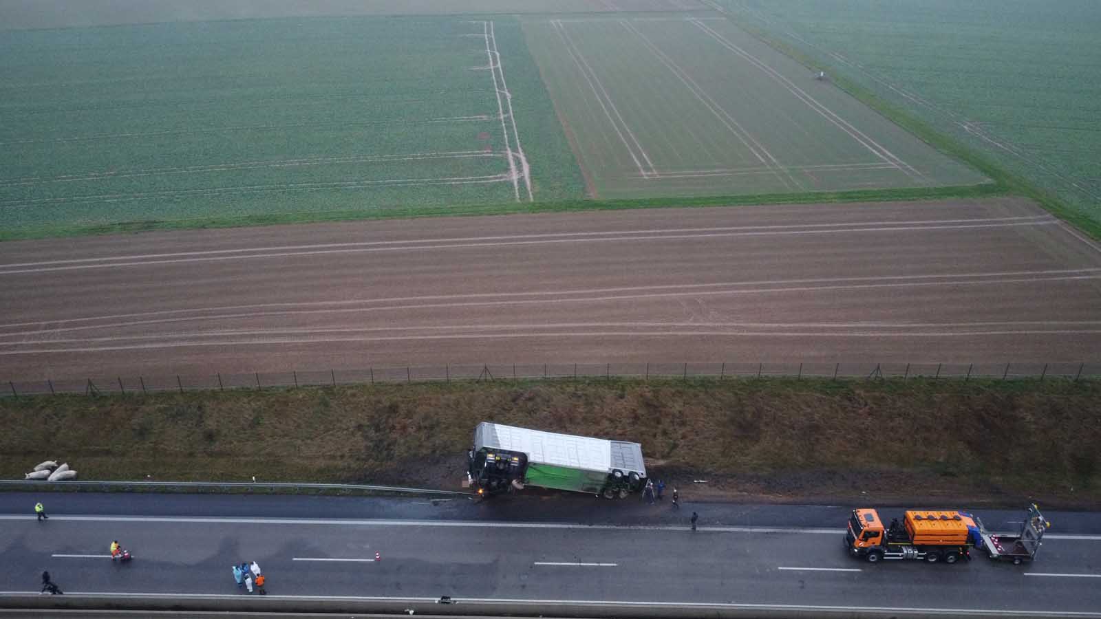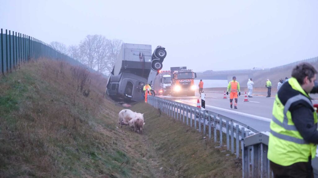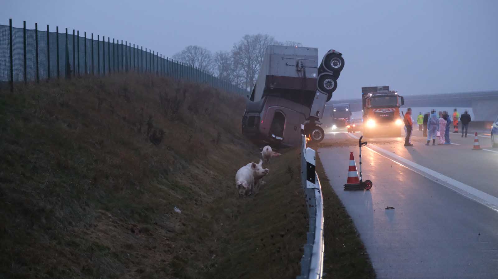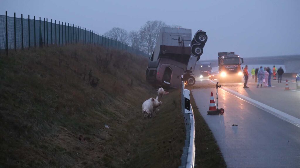 Der mit Schweinen beladene Auflieger stürzte seitlich um und wurde stark beschädigt. Mehrere Tiere liefen im Anschluss auf der Fahrbahn umher. Um eine Gefahr für den Verkehr auszuschließen, sperrten die Einsatzkräfte die Autobahn in beiden Richtungen vollständig.