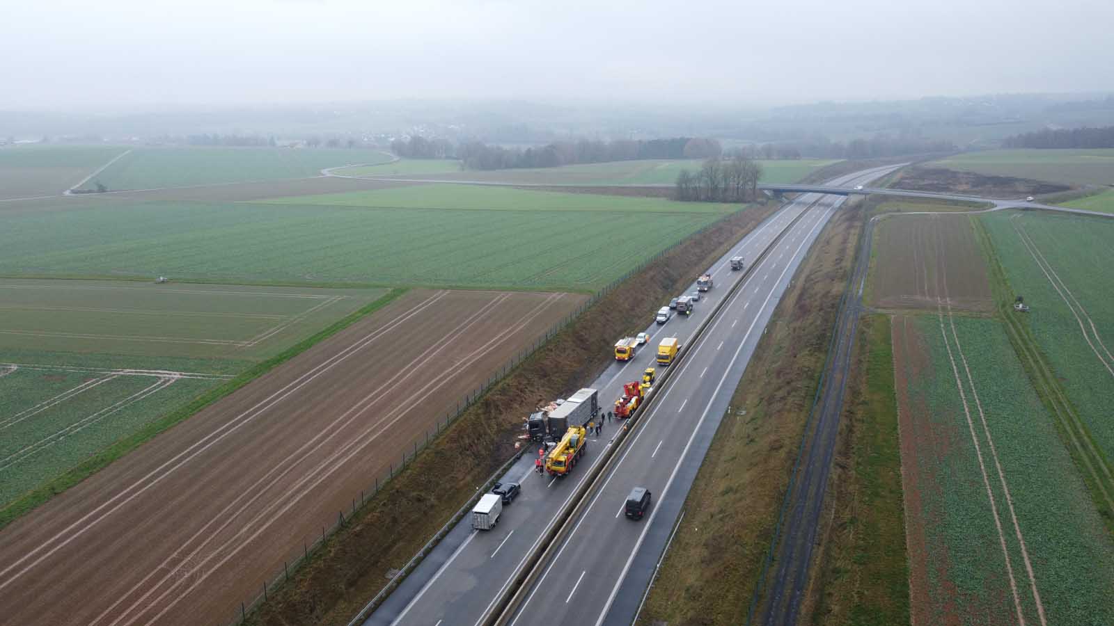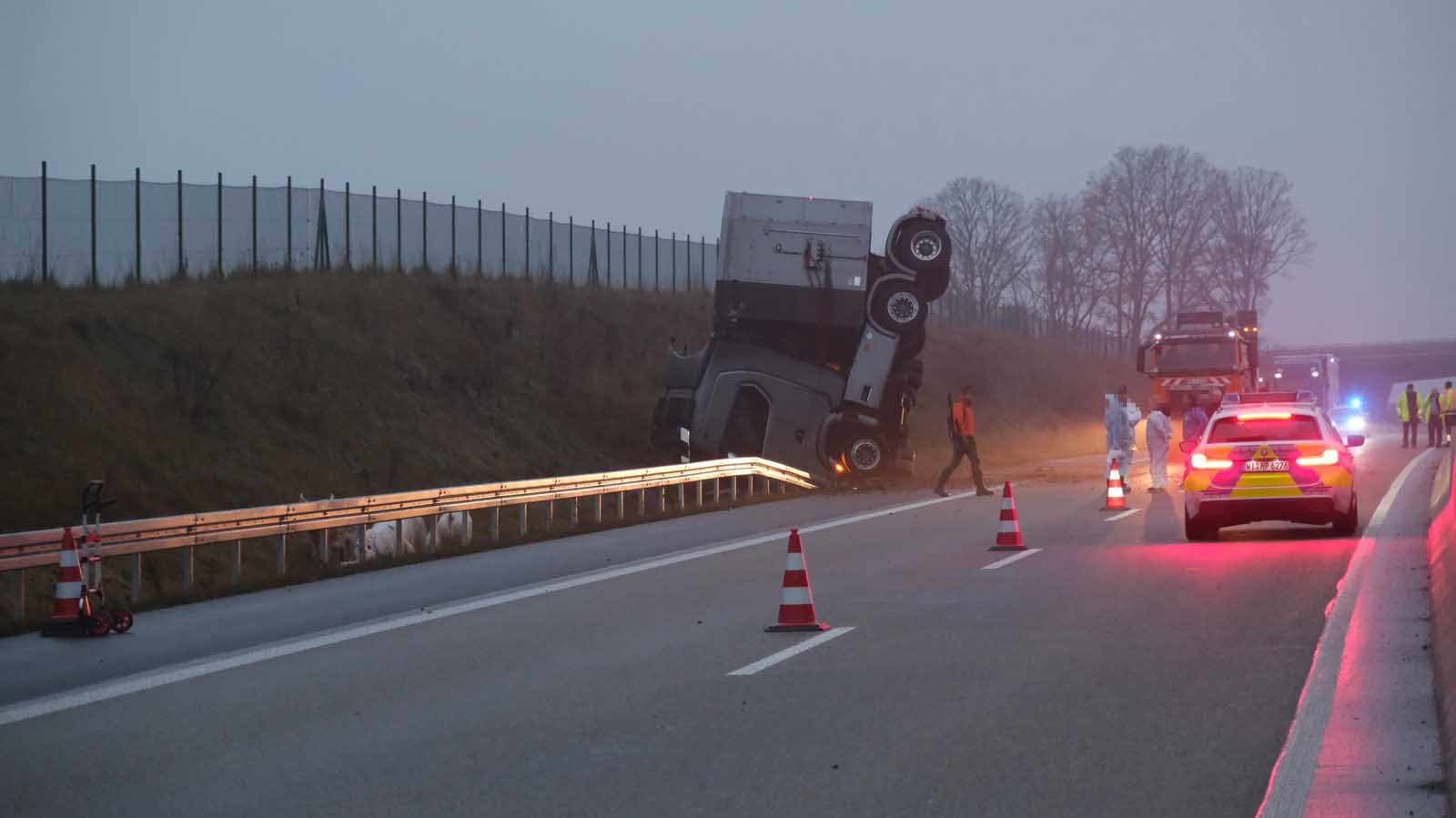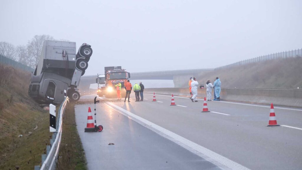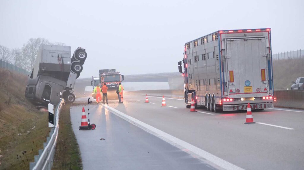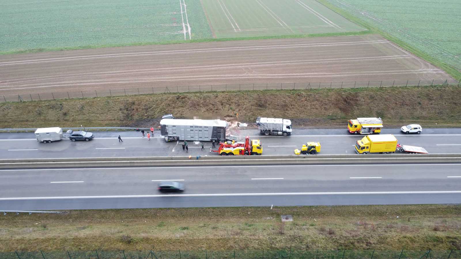 Der mit Schweinen beladene Auflieger stürzte seitlich um und wurde stark beschädigt. Mehrere Tiere liefen im Anschluss auf der Fahrbahn umher. Um eine Gefahr für den Verkehr auszuschließen, sperrten die Einsatzkräfte die Autobahn in beiden Richtungen vollständig.