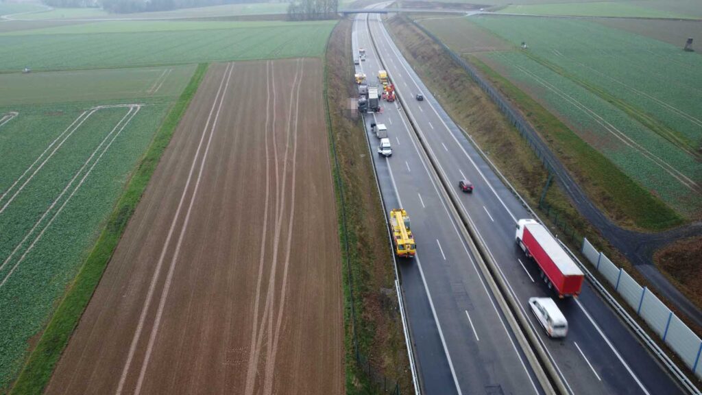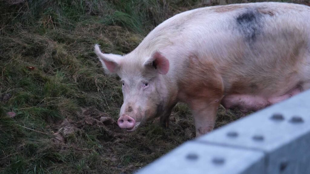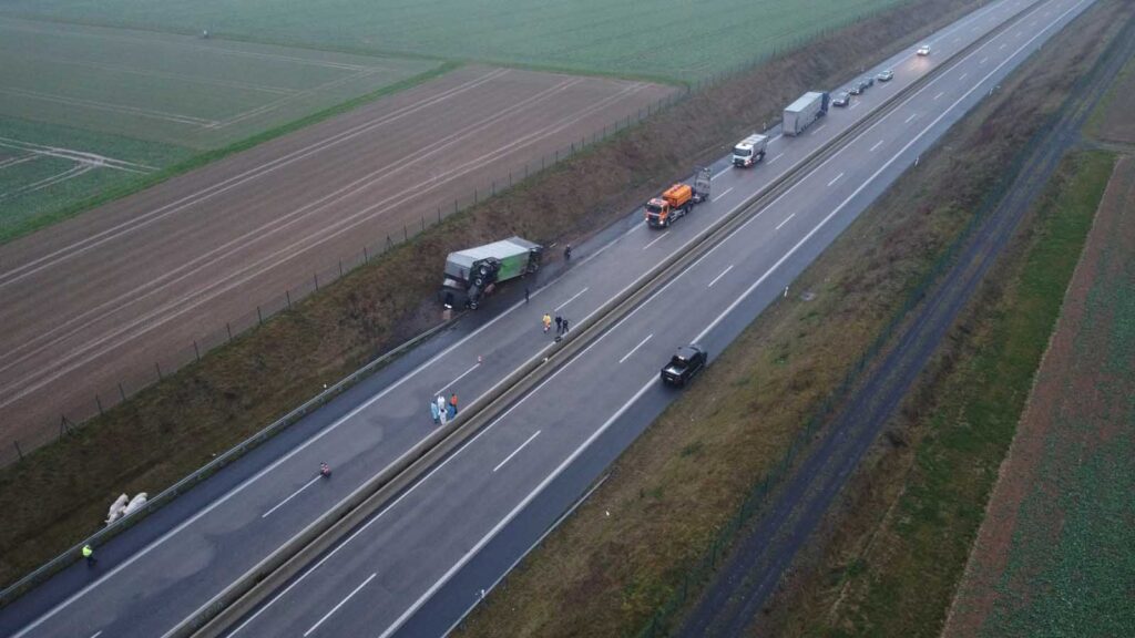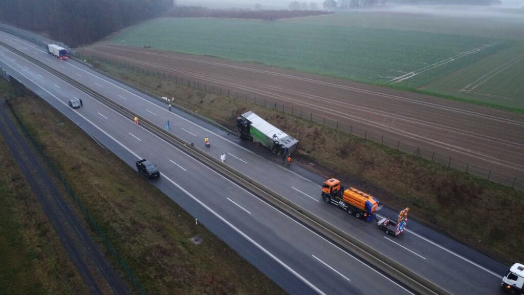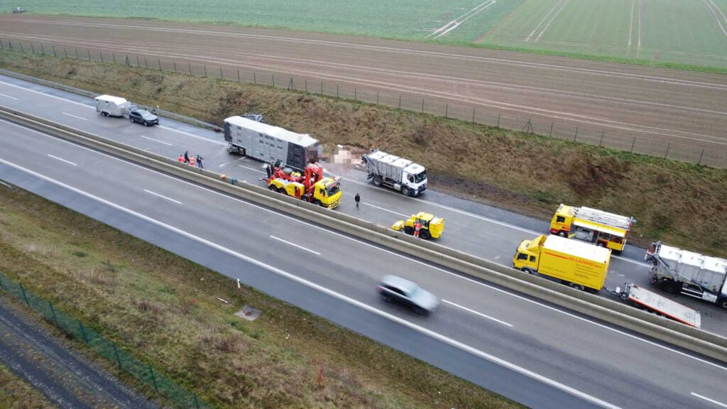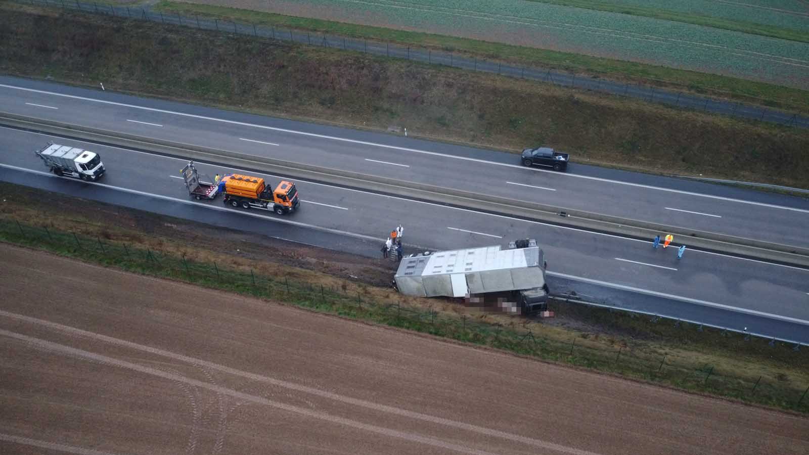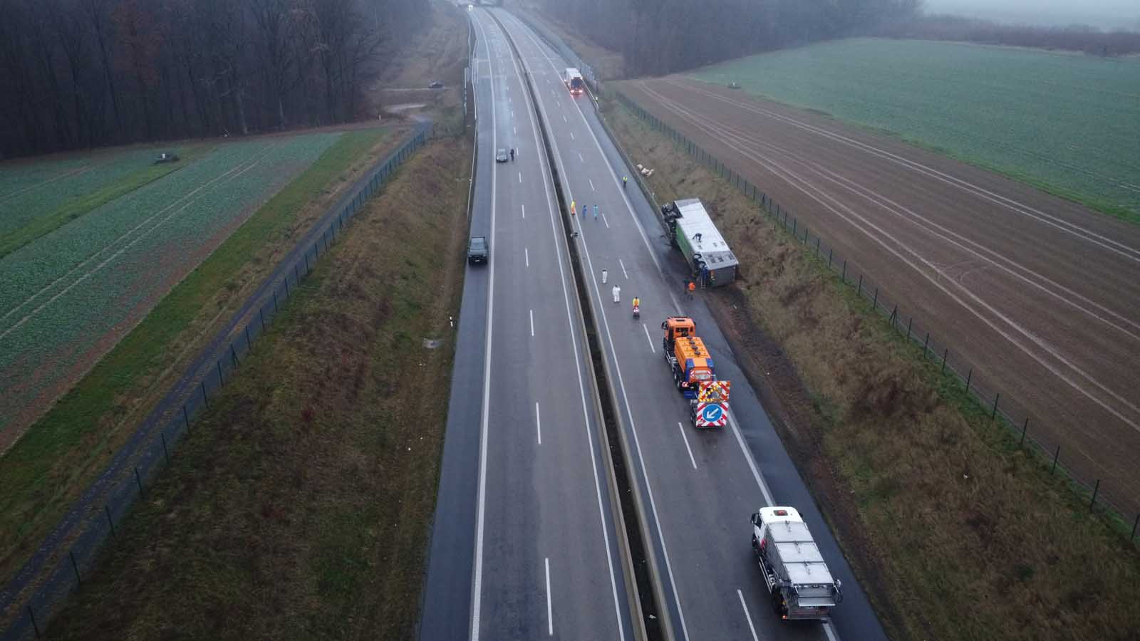 Der mit Schweinen beladene Auflieger stürzte seitlich um und wurde stark beschädigt. Mehrere Tiere liefen im Anschluss auf der Fahrbahn umher. Um eine Gefahr für den Verkehr auszuschließen, sperrten die Einsatzkräfte die Autobahn in beiden Richtungen vollständig.
