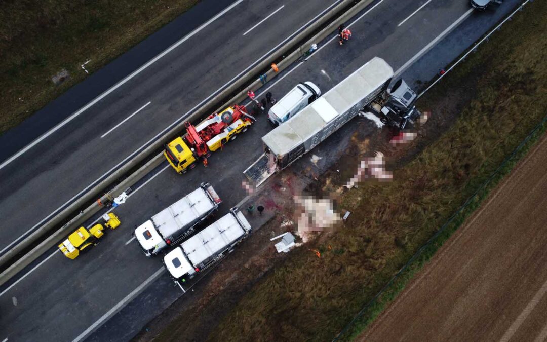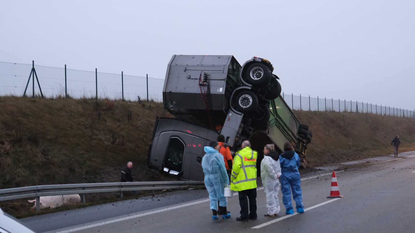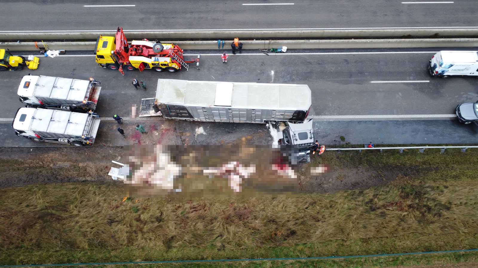 Nach dem Aufrichten des verunfallten Gespanns zeigte sich das gesamte Ausmaß des Unglücks. Dutzende verendete Schweine lagen neben dem Auflieger, weitere befanden sich noch im Frachtraum. Ein auf tierische Nebenprodukte spezialisiertes Entsorgungsunternehmen war vor Ort, um die toten Tiere zu bergen. Erst danach konnte die Vorbereitung für den Abtransport des Sattelzugs beginnen.