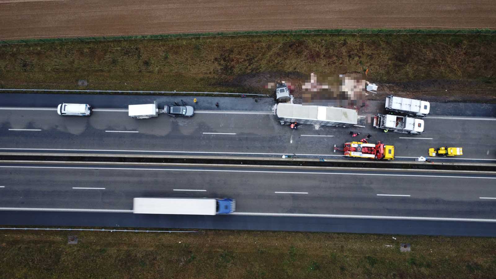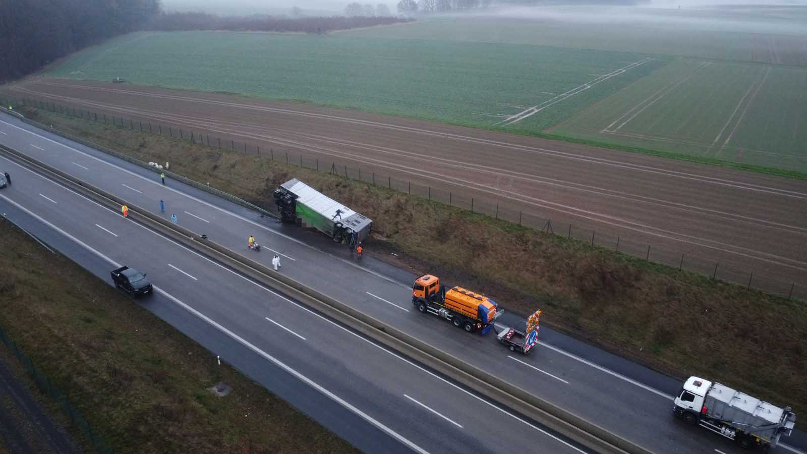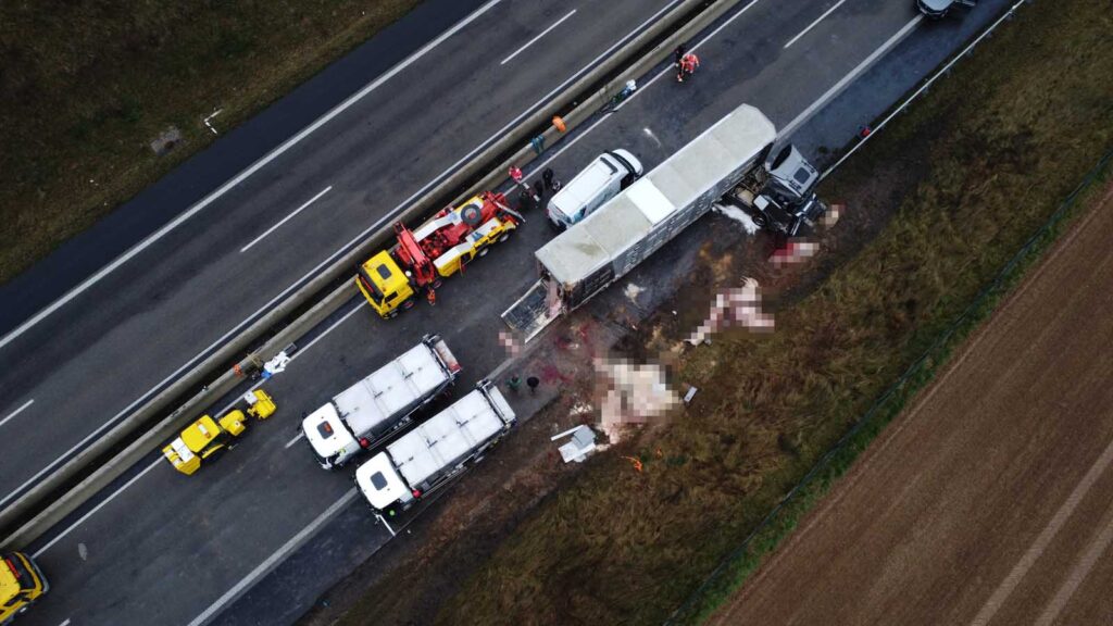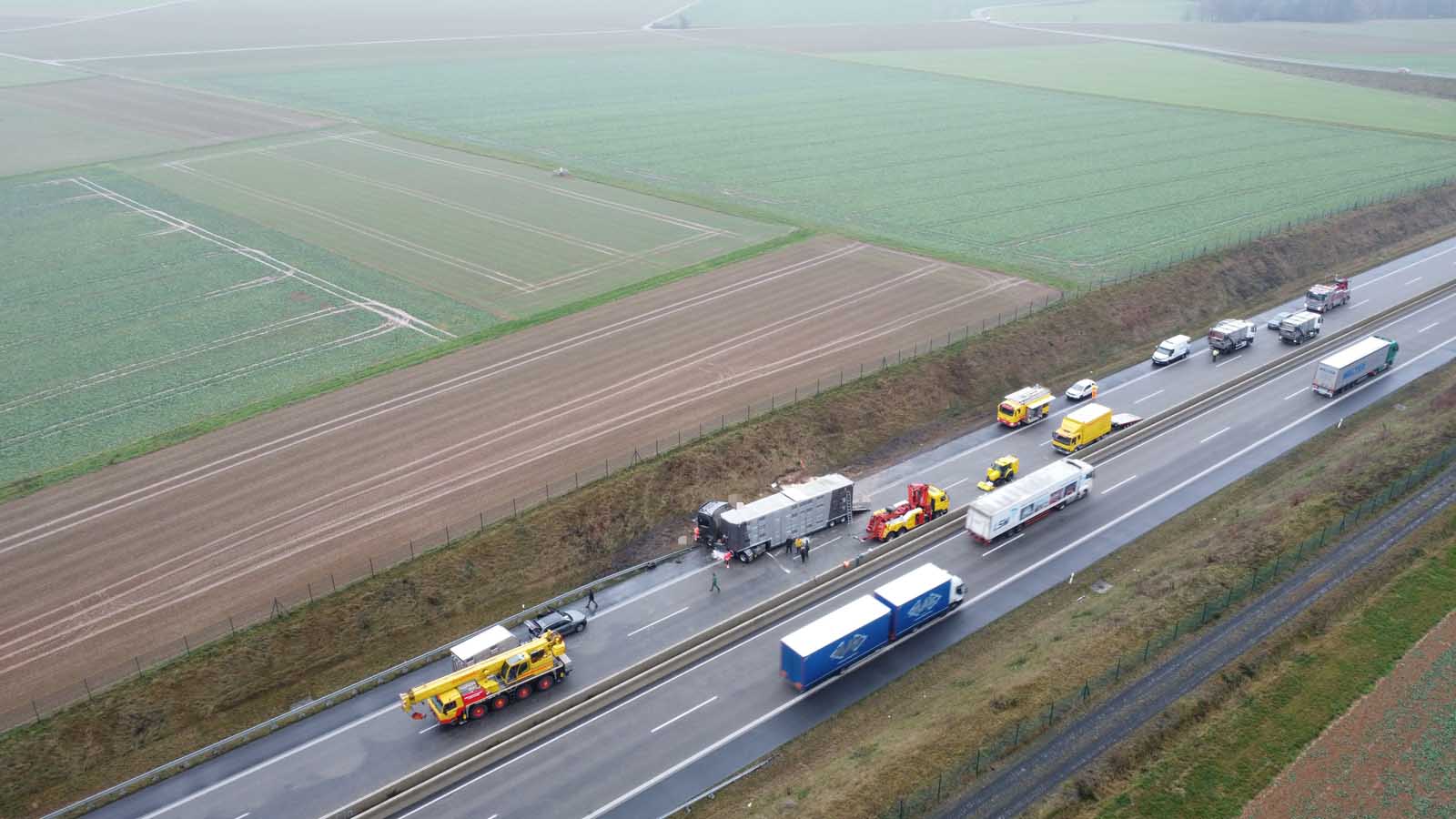 Nach dem Aufrichten des verunfallten Gespanns zeigte sich das gesamte Ausmaß des Unglücks. Dutzende verendete Schweine lagen neben dem Auflieger, weitere befanden sich noch im Frachtraum. Ein auf tierische Nebenprodukte spezialisiertes Entsorgungsunternehmen war vor Ort, um die toten Tiere zu bergen. Erst danach konnte die Vorbereitung für den Abtransport des Sattelzugs beginnen.