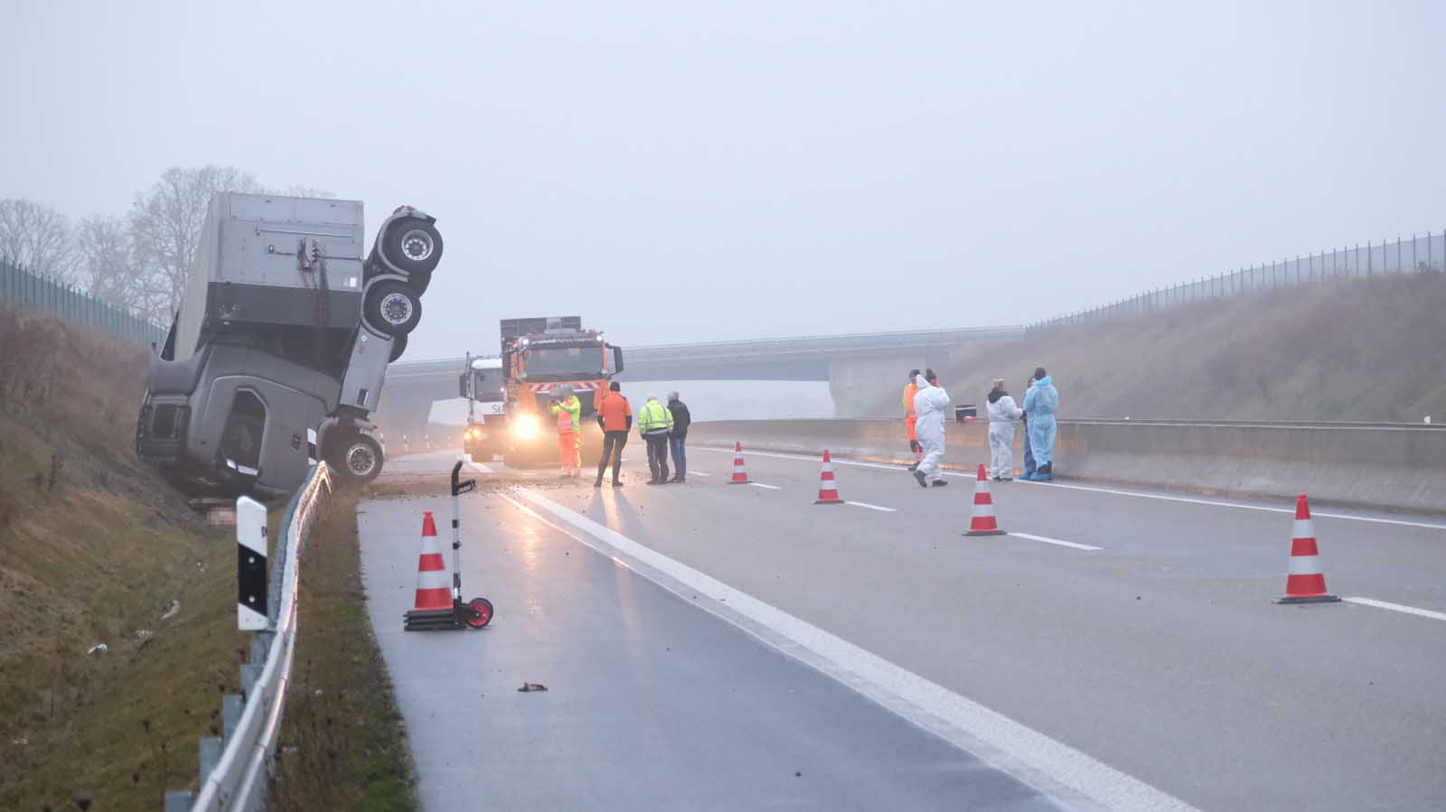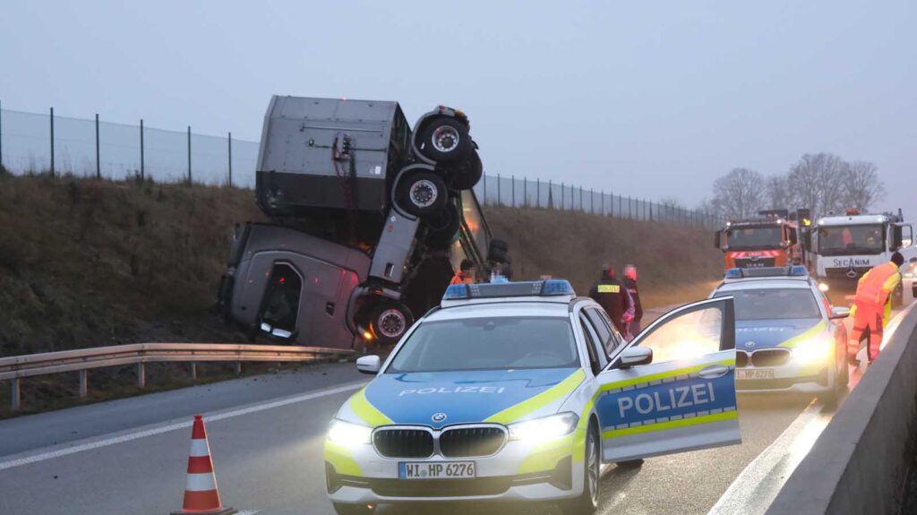 Der Unfall ereignete sich gegen 4:20 Uhr auf dem rechten Fahrstreifen der A 49 in Richtung Kassel. Ein 56-jähriger Fahrer aus Bochum kam kurz hinter der Brücke der Landesstraße zwischen Schwalmstadt-Dittershausen und Jesberg-Elnrode aus bisher ungeklärter Ursache nach rechts von der Fahrbahn ab. Die Sattelzugmaschine kippte dabei auf die Fahrzeugfront. Der Fahrer blieb unverletzt.