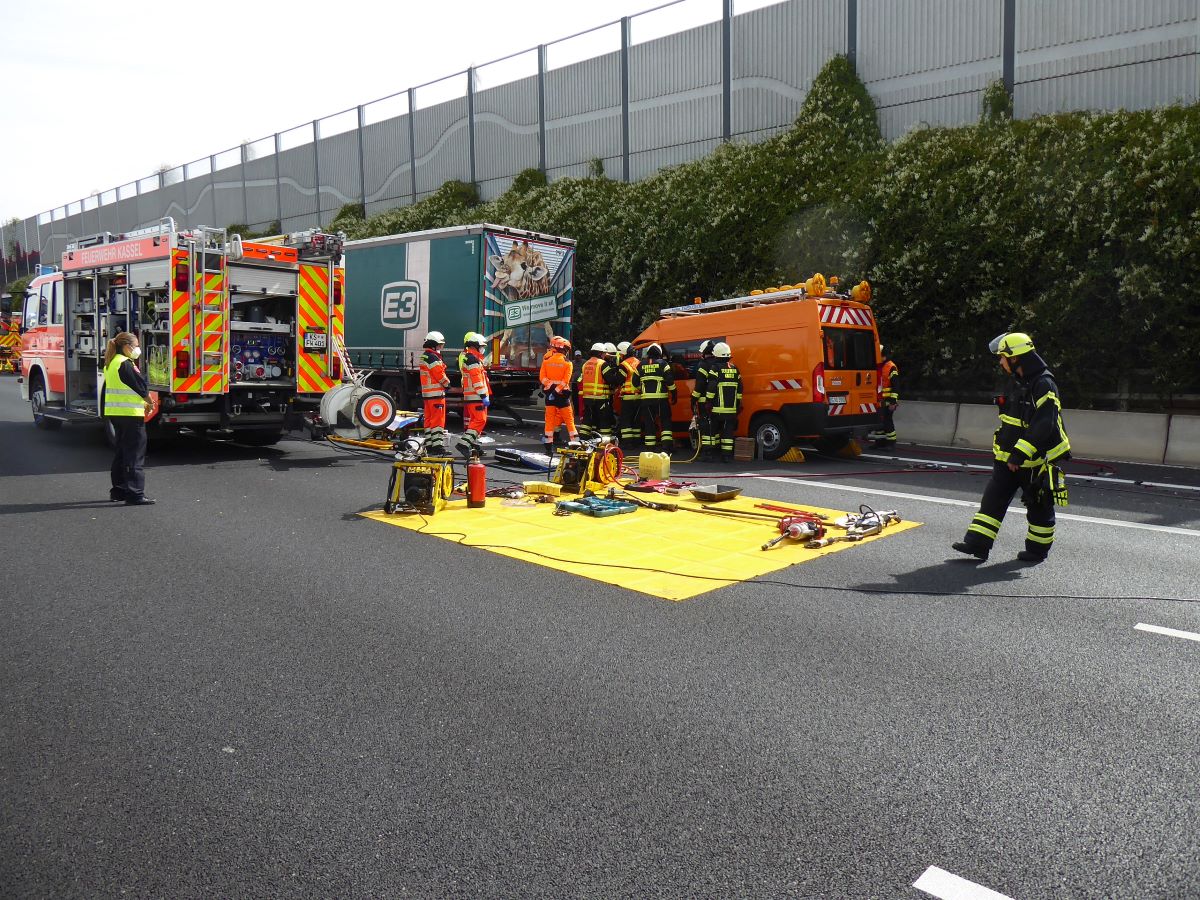 Der Sattelzug wurde zur Erstellung eines technischen Gutachtens sichergestellt und, wie auch der erheblich beschädigte Kleintransporter, von einem Abschleppunternehmen geborgen. Vor Ort waren die Berufsfeuerwehr Kassel – 23 Leute, zwei Rettungsteams, die Besatzung eines Rettungshubschraubers sowie ein Kran im Einsatz. (wal)