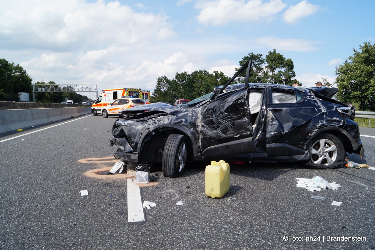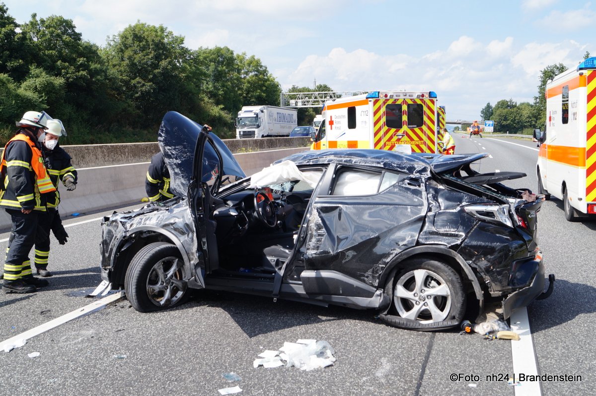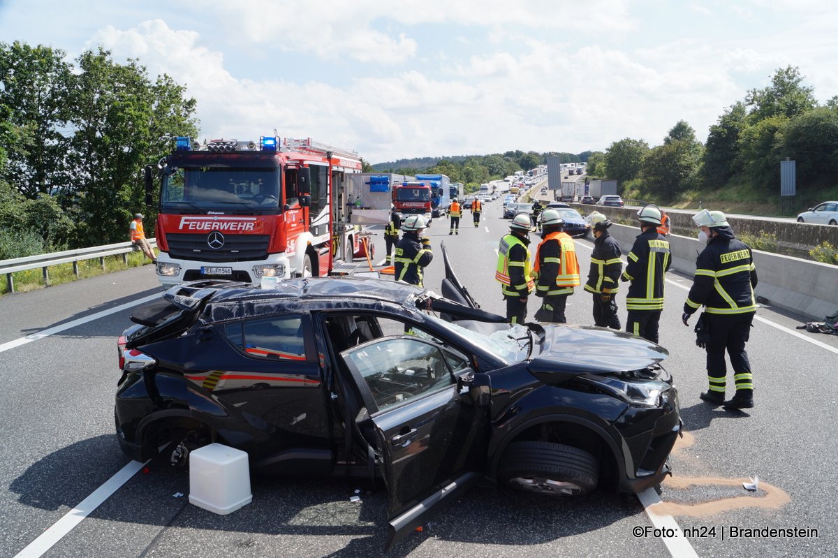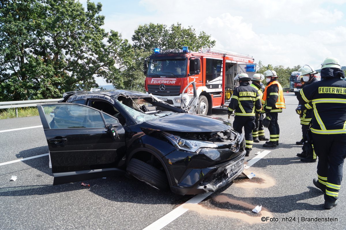 Der Unfallhergang ist noch unklar. Ein BMW und ein Toyota touchierten sich möglicherweise beim Wechseln der Fahrspur. In der Folge prallte der Toyota, besetzt mit dem Fahrer und einer Beifahrerin, gegen die Leitplanke der linken Fahrspur. Anschließend überschlug sich das Auto mit den beiden Insassen vermutlich mehrfach. Der BMW, besetzt mit dem Fahrer, schleuderte über die Autobahn und kam ebenfalls schwerbeschädigt zum Stillstand.