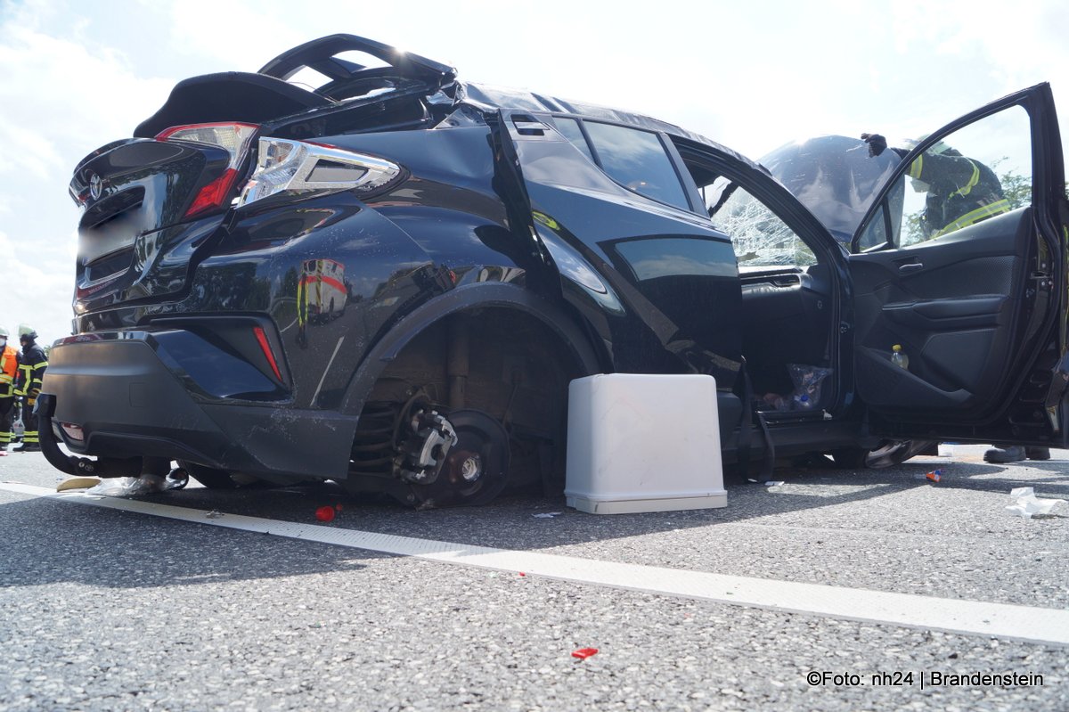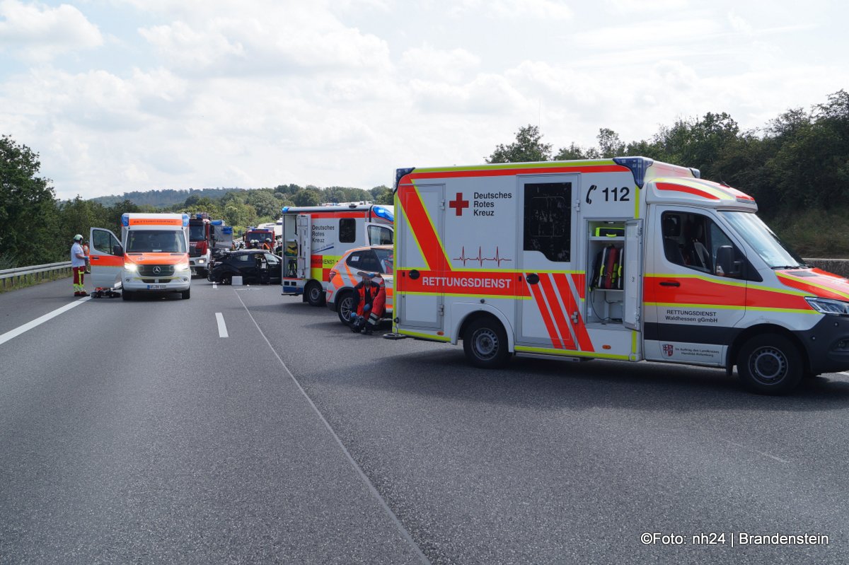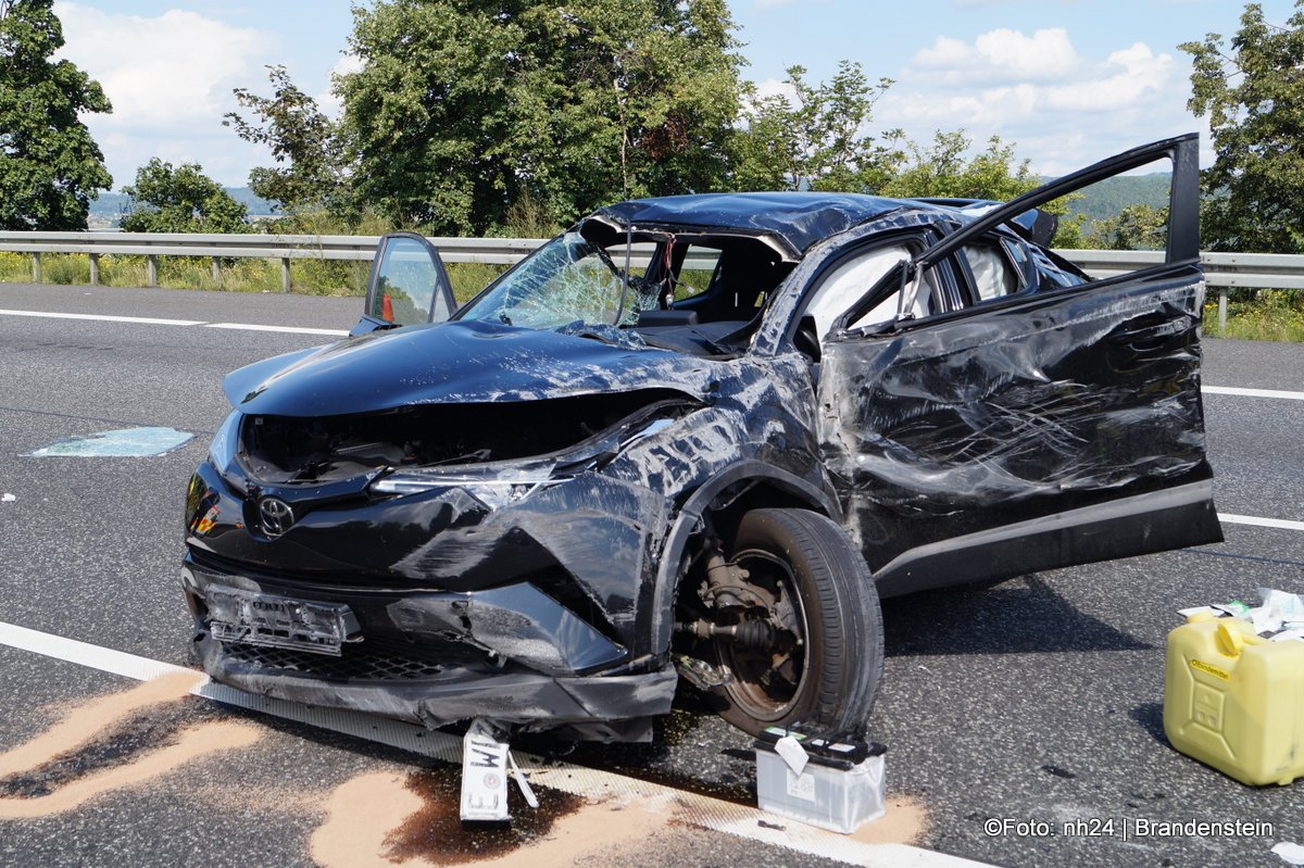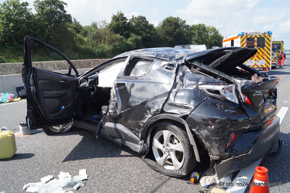 Der Unfallhergang ist noch unklar. Ein BMW und ein Toyota touchierten sich möglicherweise beim Wechseln der Fahrspur. In der Folge prallte der Toyota, besetzt mit dem Fahrer und einer Beifahrerin, gegen die Leitplanke der linken Fahrspur. Anschließend überschlug sich das Auto mit den beiden Insassen vermutlich mehrfach. Der BMW, besetzt mit dem Fahrer, schleuderte über die Autobahn und kam ebenfalls schwerbeschädigt zum Stillstand.