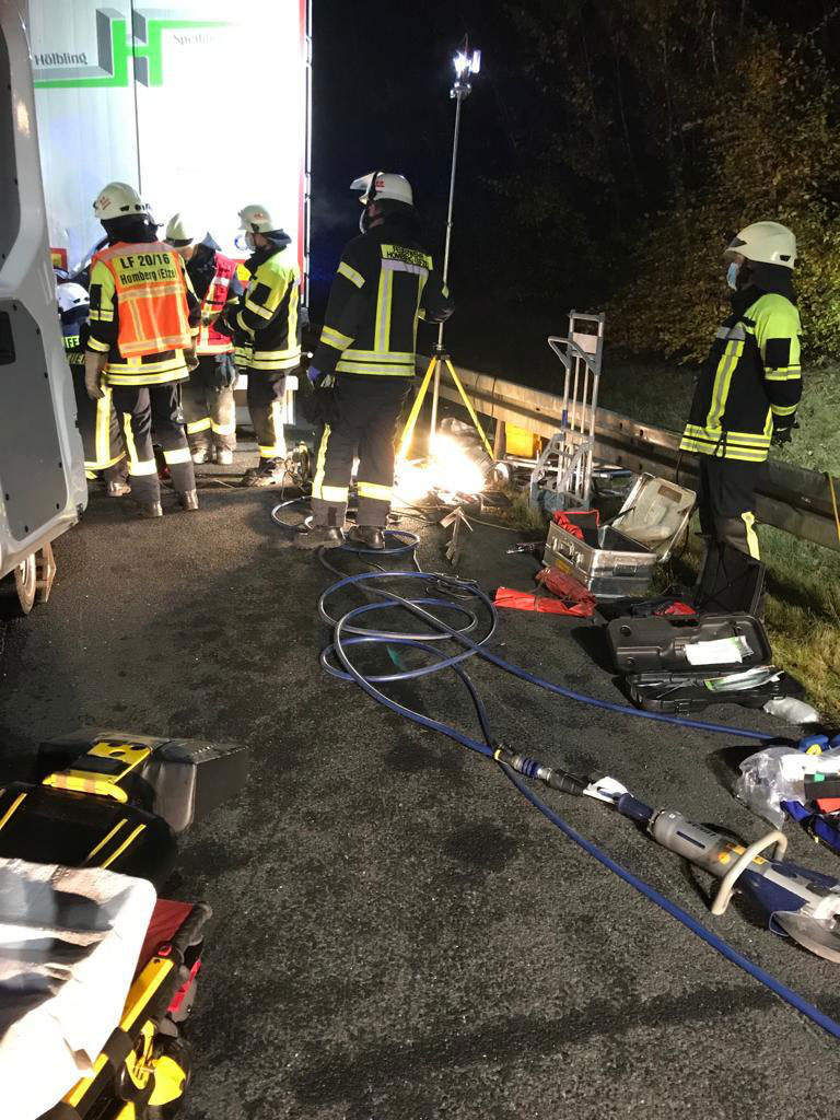 Der Fahrer wurde bei dem Unfall leicht verletzt und erlitt einen Schock. Die eingeklemmte 18-Jährige musste von Homberger Feuerwehrleuten mit hydraulischem Gerät aus dem Transporter befreit werden. Beide wurden nach ihrer Erstversorgung in Krankenhäuser gebracht. Mehrere Rettungshubschrauber wurden angefordert, konnten aber aufgrund der Wetterbedingungen nicht fliegen.