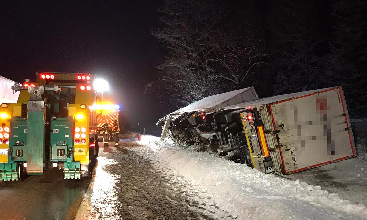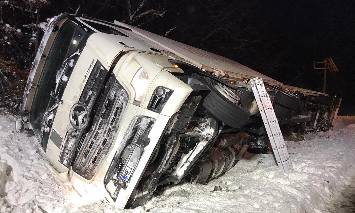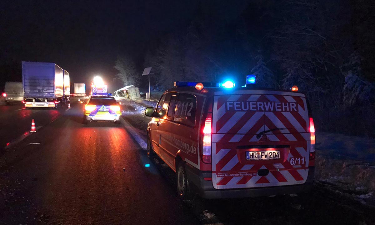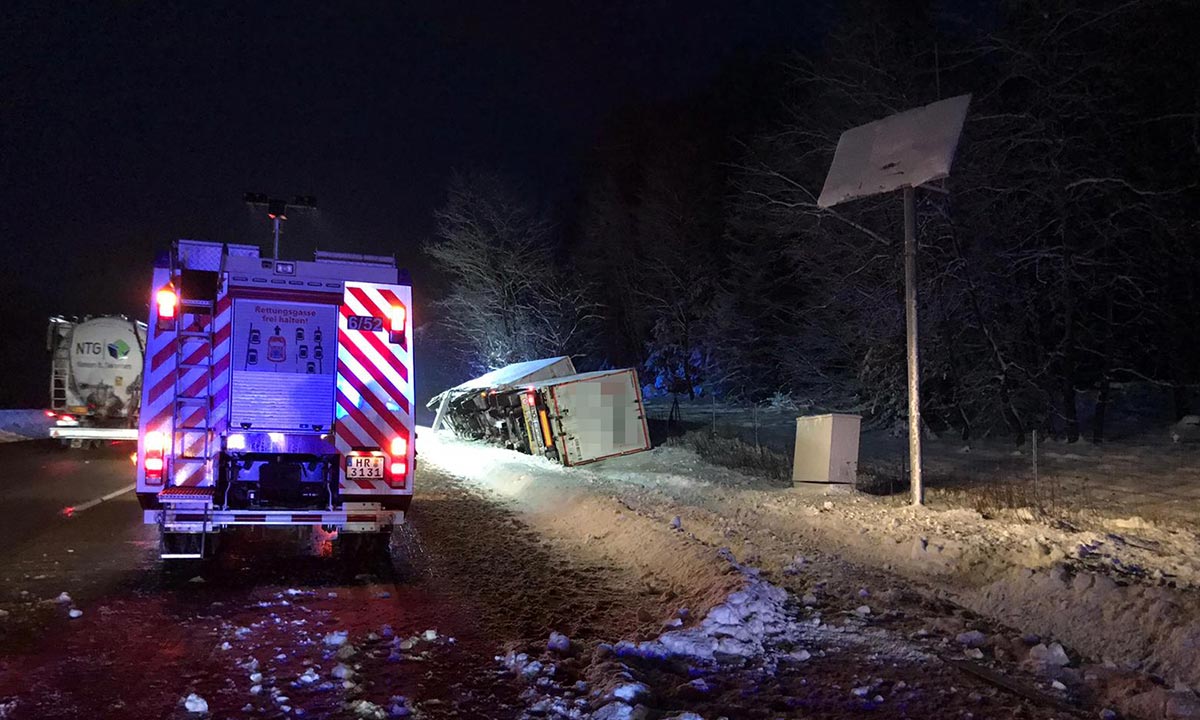 Der Lastzugfahrer aus der Tschechischen Republik befuhr gegen 5:10 Uhr den rechten von drei Fahrstreifen in nördlicher Fahrtrichtung. Vermutlich aufgrund der Witterung nicht angepasster Geschwindigkeit geriet der Lkw im Kurvenbereich eines Gefällstücks ins Rutschen.