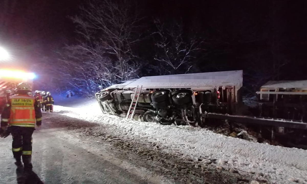Im weiteren Verlauf kam der Lastzug nach rechts von der Fahrbahn ab, drückte die angrenzende Schutzplanke nieder, rutschte ca. 70 Meter durch den Graben und kippte in Höhe von Ellingshausen in die Böschung.