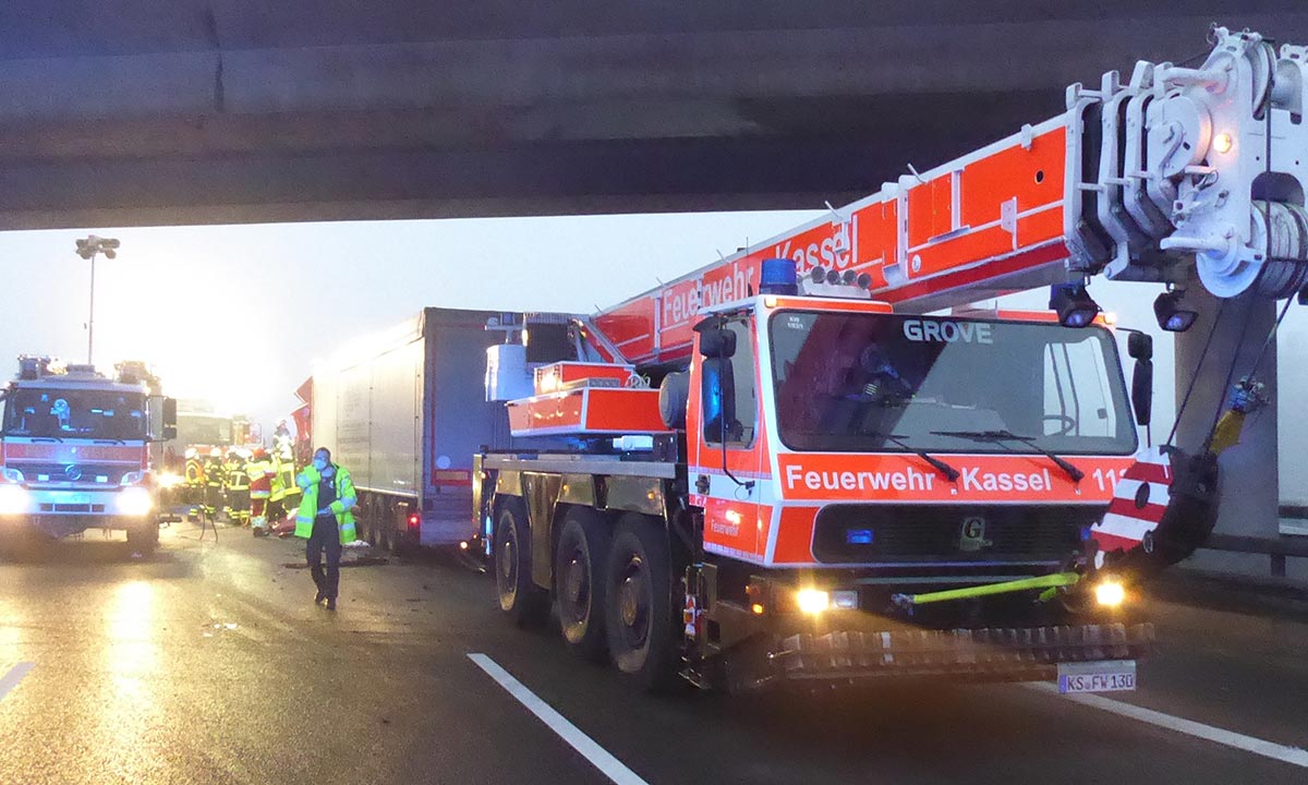 Im Einsatz waren 26 Kräfte der Feuerwache 1 mit Feuerwehrkran, zwei Rettungs- und ein Notarztteam sowie Beamte der Polizeiautobahnstation Baunatal. (wal)