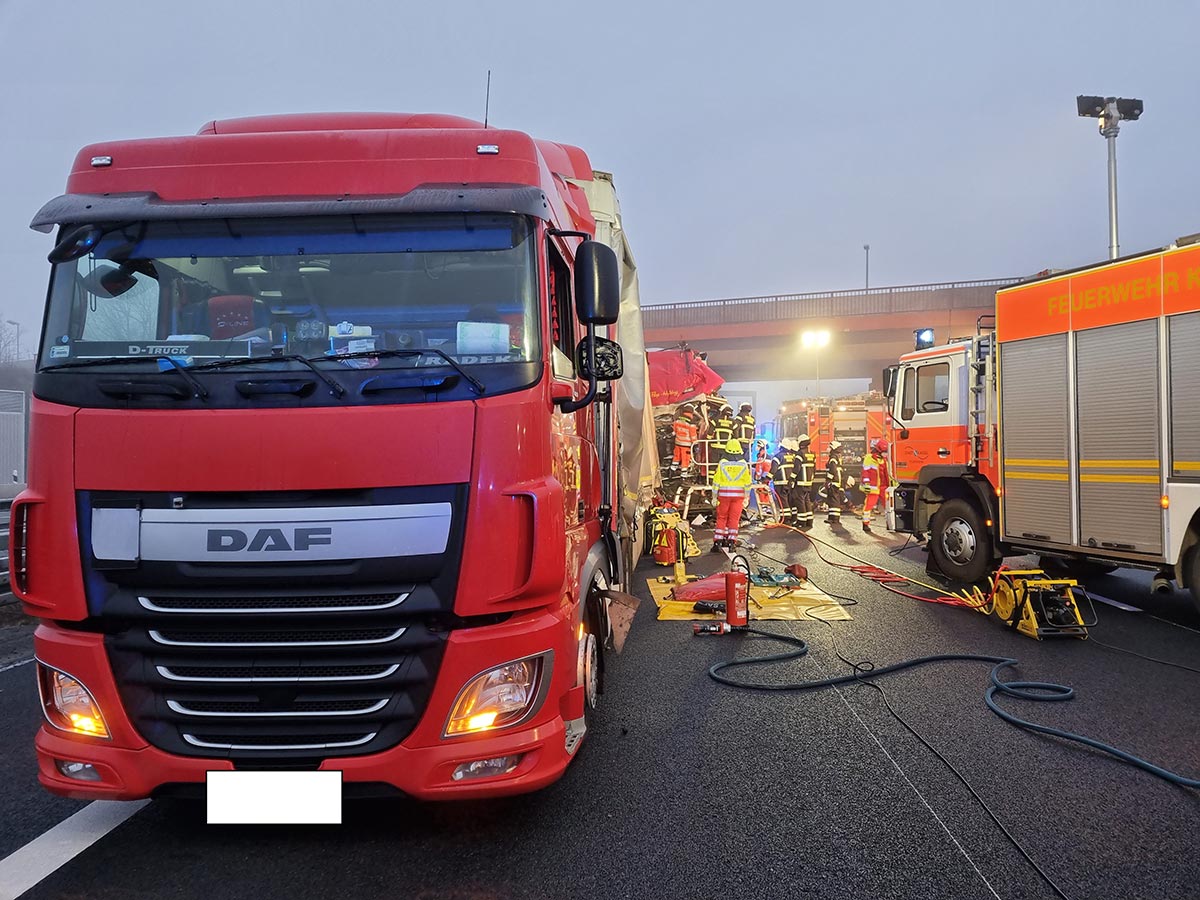 Ein mit Schottersteinen beladener Sattelzug ist auf einen am Stauende haltenden Sattelzug eines 38-jährigen Mannes aus Polen aufgefahren. Hierbei wurde das Fahrerhaus des auffahrenden Lkw so weit deformiert, dass der Fahrer schwer eingeklemmt wurde. Die Feuerwehr setzte technisches Gerät ein, um den Fahrer aus der Kabine zu befreien. „Trotz sofort eingeleiteter Rettungsmaßnahmen verstarb der Fahrer an der Einsatzstelle“, berichtet Feuerwehr Einsatzleiter Matthias Schacht.