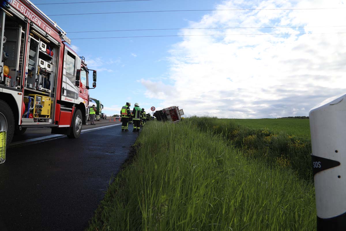 Ebenfalls in Fahrtrichtung Süden ereignete sich gegen 19:40 Uhr kurz vor der Anschlussstelle Bad Hersfeld West ein weiterer Lkw-Unfall. Ein Anhänger kippte auf die Fahrbahn und blockierte alle Fahrspuren.