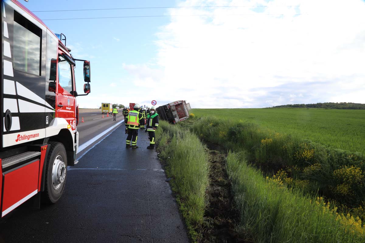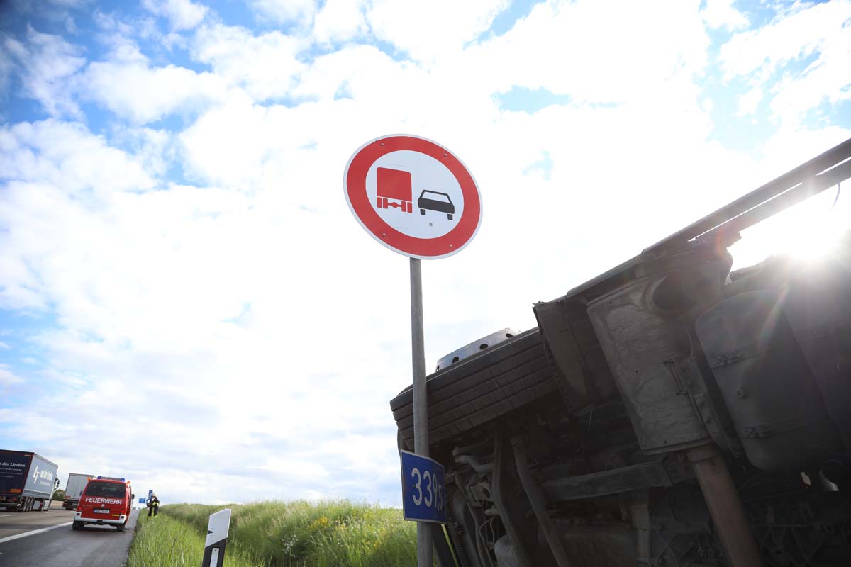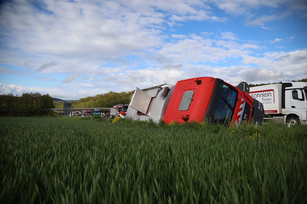 Der Anhänger des Lastzuges fiel bei dem Schleudermanöver auf die Seite und blockierte zusammen mit dem noch immer angekoppeltem Lkw alle drei Fahrstreifen und Standstreifen.