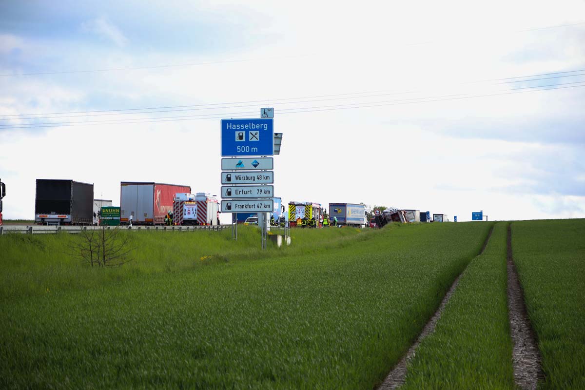 Während der Bergungs- und Aufräumarbeiten musste die Fahrbahn in Richtung Kassel für ca. 30 Minuten, in Richtung Würzburg für 90 Minuten voll gesperrt werden.
