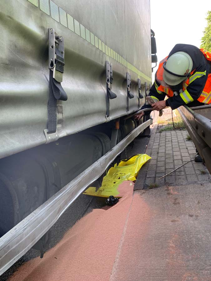 Die Homberger Feuerwehrleute sicherten die Unfallstelle zudem noch ab, kümmerten sich um den defekten Tank des Lkw und nahmen ausgelaufene Betriebsstoffe auf. Zu guter Letzt barg die Feuerwehr noch den unter dem Heck des Lkw verkeilten Pkw mit der Hilfe der Seilwinde des Rüstfahrzeugs.