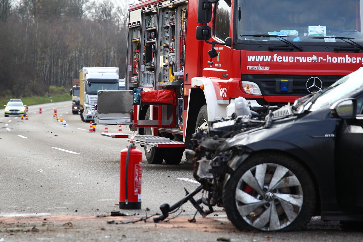 15 Homberger Feuerwehrleute unter der Leitung von Udo Helwig sicherten die Unfallstelle ab, banden ausgelaufene Betriebsmittel, stellten den Brandschutz sicher und entfernten Trümmer des VWs von der Fahrbahn. Weitere Feuerwehrleute kümmerten sich um den Hund, der später von einer weiteren Streifenwagenbesatzung der Polizei am Unfallort abgeholt wurde.
