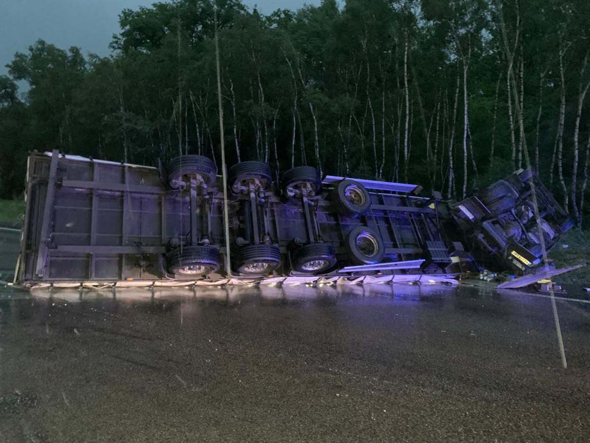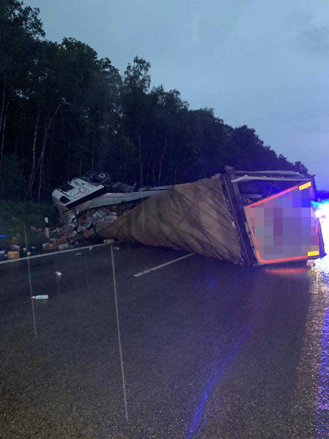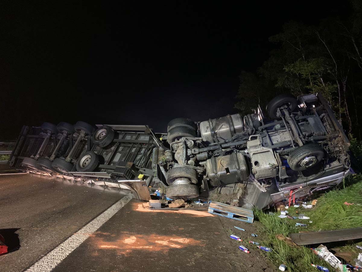 HOMBERG/EFZE (wal). Auf der Autobahn 7 zwischen den Anschlussstellen Homberg/Efze und Malsfeld ist am Montag gegen 21:10 Uhr ein Sattelzug umgekippt. Der 21 Jahre alte Fahrer aus Serbien erlitt schwere, keine lebensbedrohlichen Verletzungen. Eingeklemmt, wie zunächst vermutet, wurde er in dem Fahrerhaus der Sattelzugmaschine aber nicht.