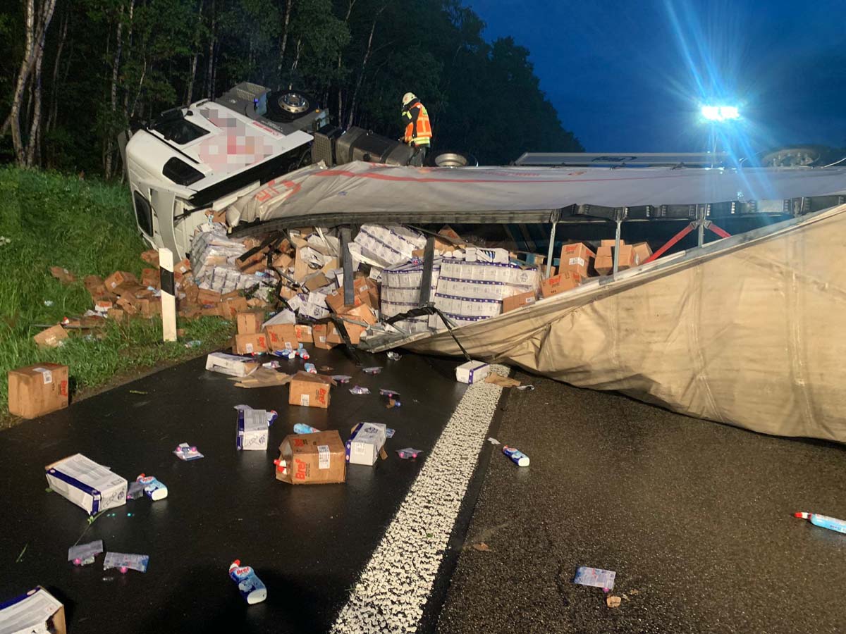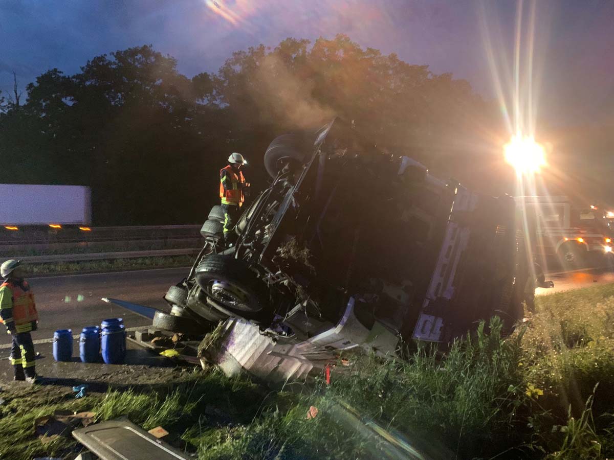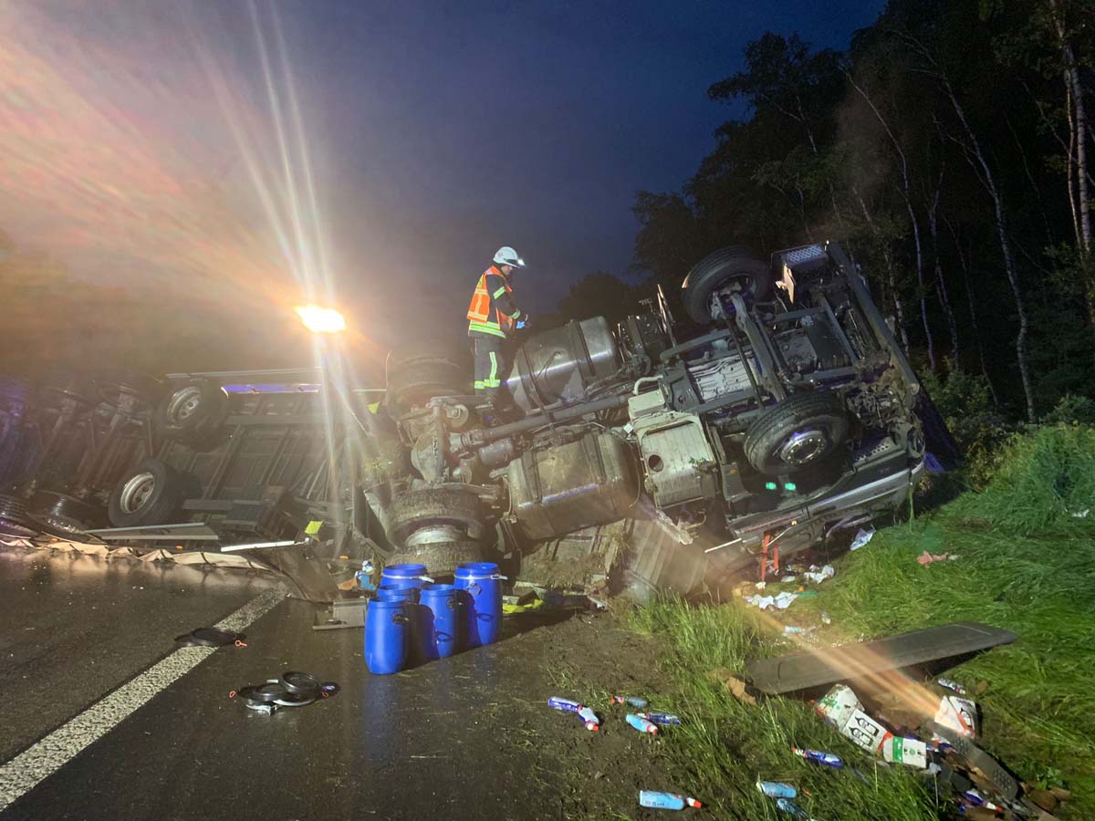 Die Feuerwehrleute sicherten die Unfallstelle ab und leuchteten den havarierten Lkw aus. Zudem nahmen sie ausgelaufene Betriebsmittel auf und pumpten rund 450 Liter Diesel aus den Tanks der Sattelzugmaschine. Der Auflieger hatte handelsübliche Reinigungsmittel jeglicher Arte geladen, die sich teilweise auf der Autobahn verteilten. Messungen der Feuerwehr ergaben aber keine Gefährdung für die Umwelt. Vorsichtshalber wurde aber trotzdem ein Kanalabfluss abgedichtet und die Untere Wasserbehörde des Landkreises über den Vorfall informiert.