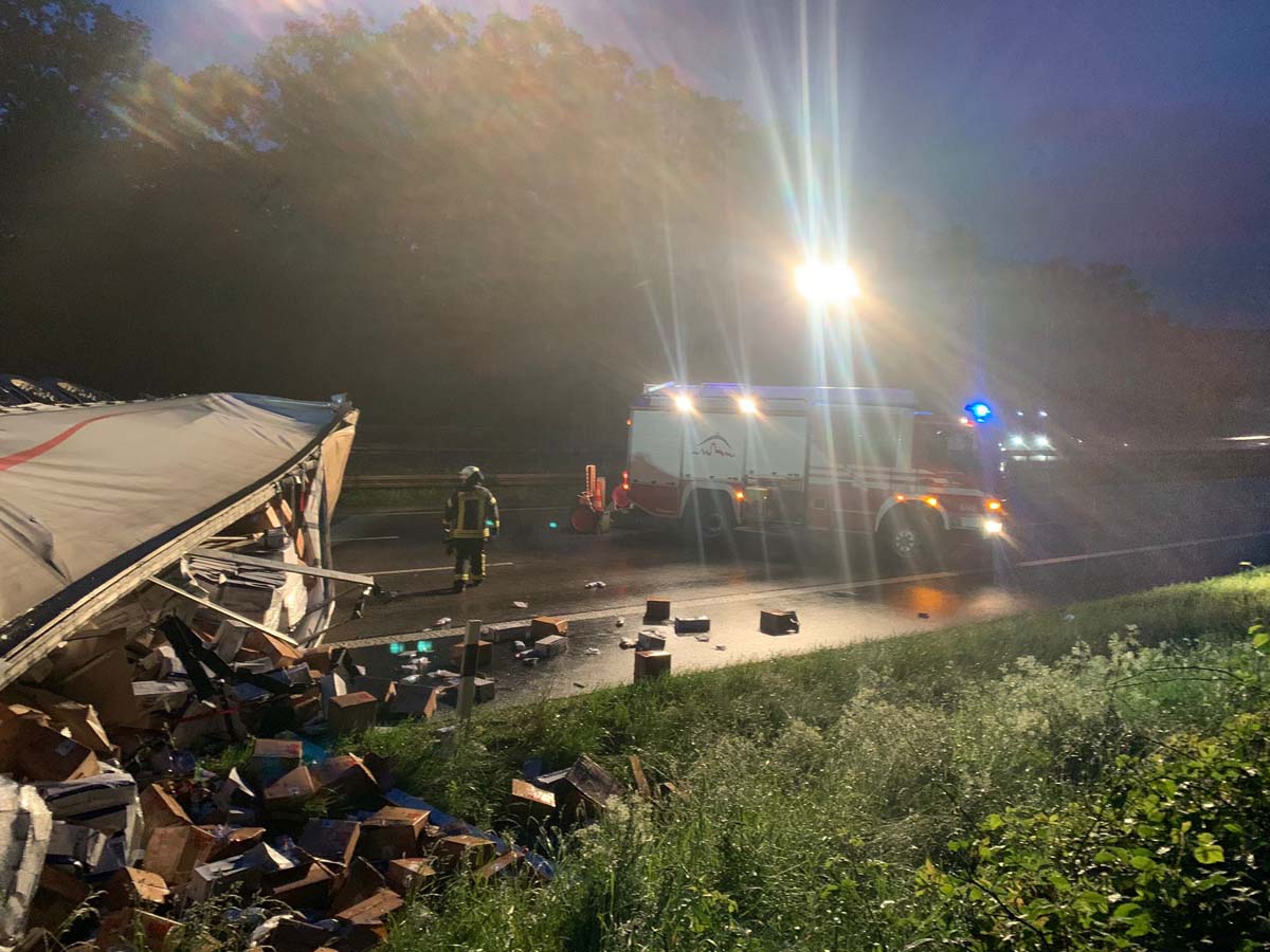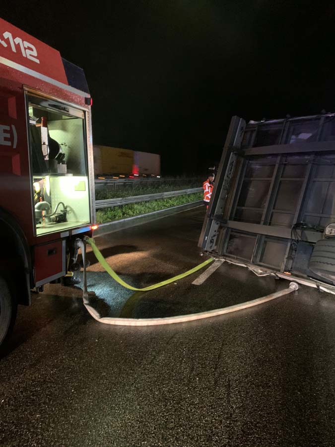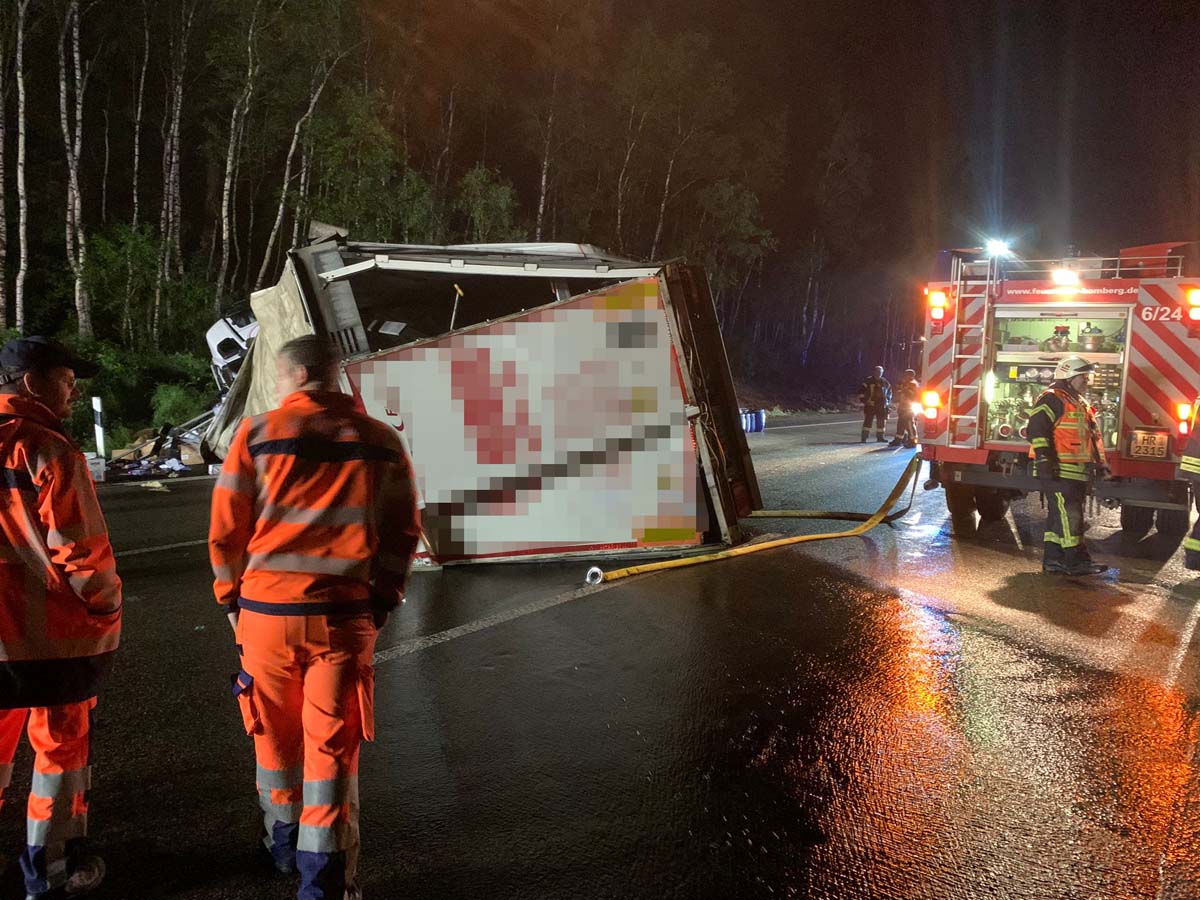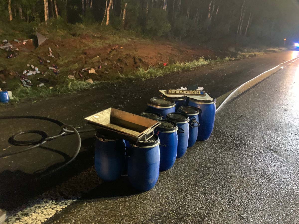 Die Feuerwehrleute sicherten die Unfallstelle ab und leuchteten den havarierten Lkw aus. Zudem nahmen sie ausgelaufene Betriebsmittel auf und pumpten rund 450 Liter Diesel aus den Tanks der Sattelzugmaschine. Der Auflieger hatte handelsübliche Reinigungsmittel jeglicher Arte geladen, die sich teilweise auf der Autobahn verteilten. Messungen der Feuerwehr ergaben aber keine Gefährdung für die Umwelt. Vorsichtshalber wurde aber trotzdem ein Kanalabfluss abgedichtet und die Untere Wasserbehörde des Landkreises über den Vorfall informiert.