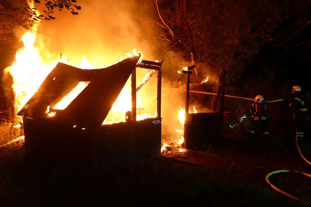 Feuer zerstört Grillhütte, Bauwagen und Schuppen