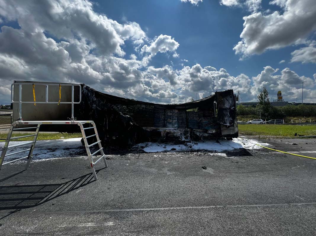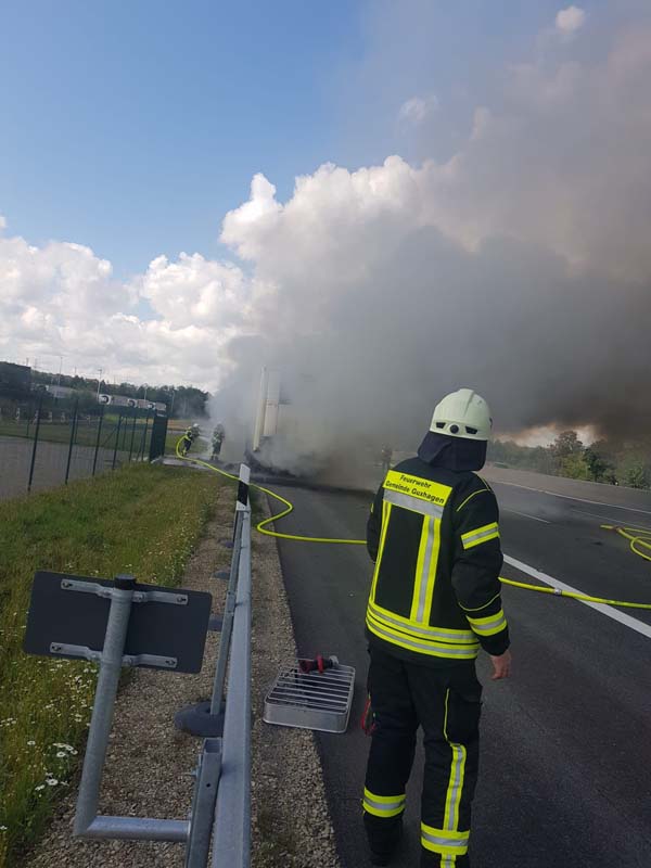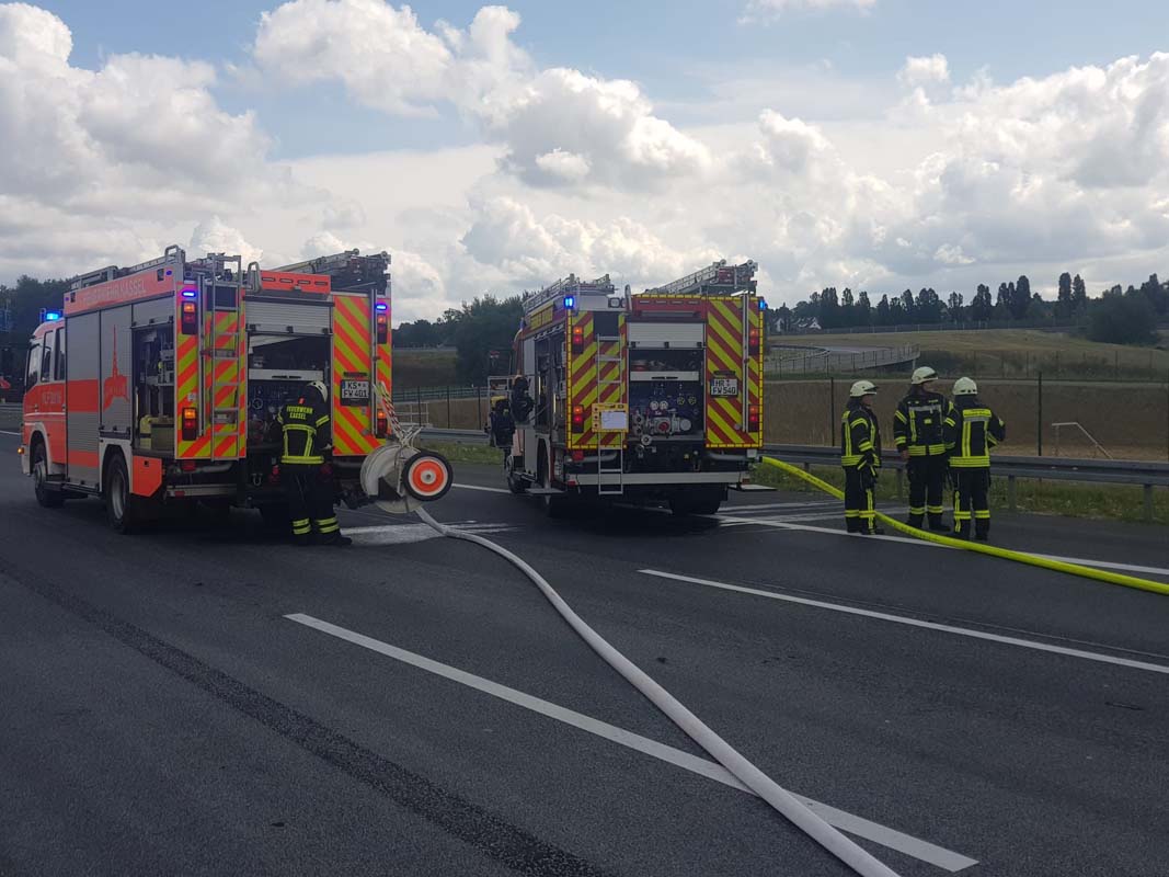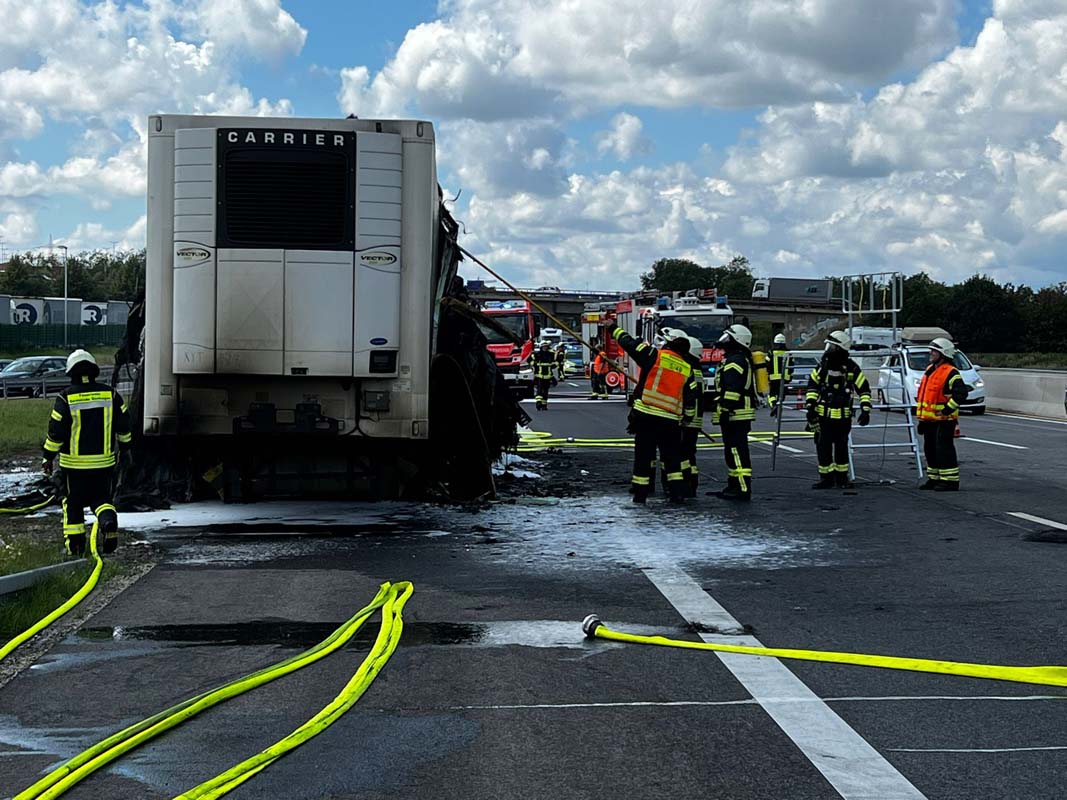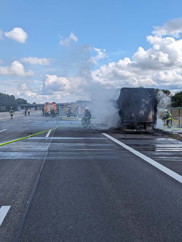 In Höhe des Lohfeldener Rüssels brannte auf der Nordfahrbahn der A 7 am Samstag gegen 11 Uhr ein mit Tiefkühlgemüse beladener Sattelauflieger. Der Fahrer des Sattelzugs konnte die Zugmaschine noch rechtzeitig abkoppeln. Er blieb unverletzt und die Sattelzugmaschine unbeschädigt. Zwei Trupps unter Atemschutz löschten die Flammen und verhinderten ein Übergreifen auf das Kühlaggregat sowie einen Kraftstofftank. Die Zusammenarbeit mit der Feuerwehr Guxhagen verlief dabei äußerst professionell und positiv, berichtete Sascha Reuß, Einsatzleiter der Kasseler Berufsfeuerwehr. Die Nachlöscharbeiten gestalteten sich etwas aufwendiger, da die Wände mit einer Säbelsäge aufgeschnitten werden mussten, um an alle Glutnester zu gelangen. „Der Kühlauflieger bestand zum Großteil aus kohlenstofffaserverstärktem Kunststoff. Hier bestand die Gefahr, dass bei einem Brand lungenschädigende Fasern entstehen und sich durch den Brandrauch verteilen könnten“, erklärte Robin Stephan von der Feuerwehr Guxhagen. Die beiden Feuerwehren waren mit insgesamt neun Fahrzeugen und 34 Einsatzkräften vor Ort. Ein dreiköpfiges Rettungsteam sicherte den Einsatz ab.