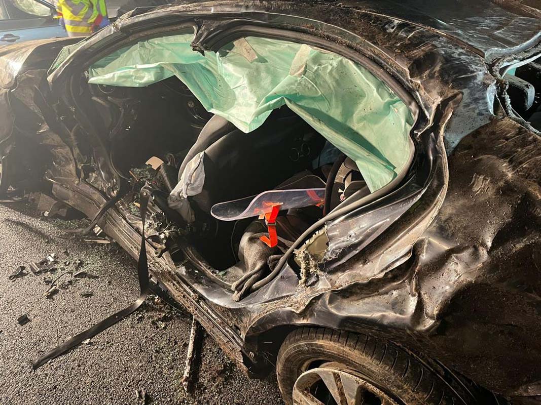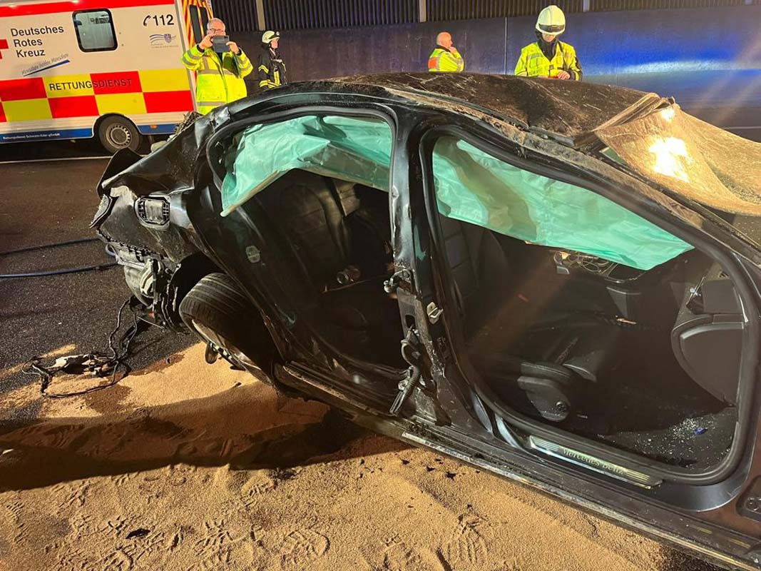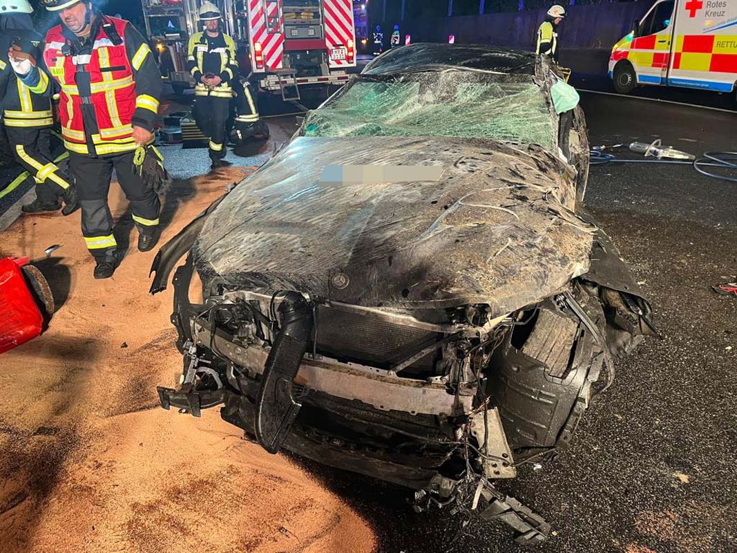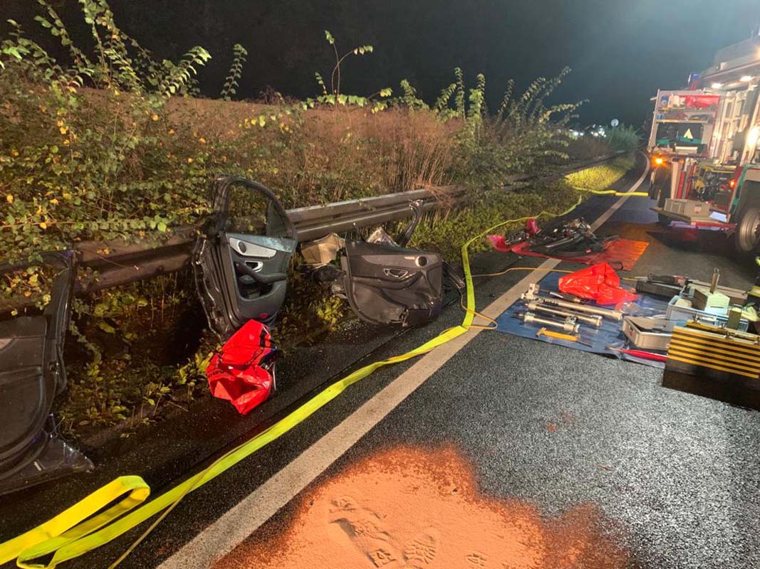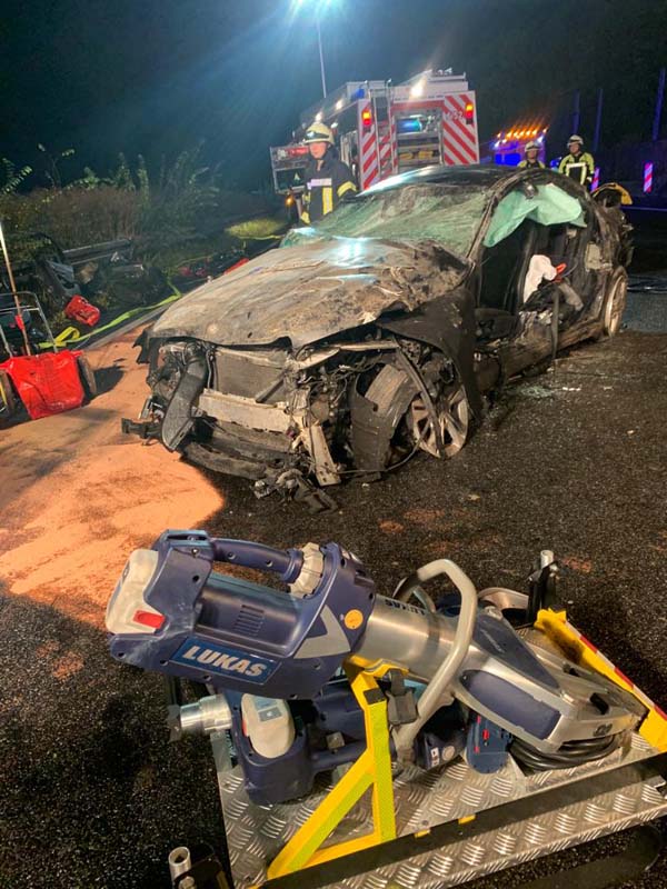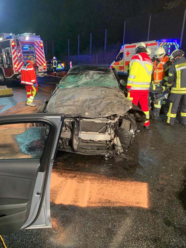 Laut einer Polizeisprecherin geschah der Unfall gegen 20:45 Uhr in der Nähe der Betriebszu- und abfahrt in Knüllwald-Völkershain. Ein 39 Jahre alter Mann fuhr mit seinem Mercedes auf dem linken Fahrstreifen. In einer leichten Linkskurve verlor er aufgrund nicht angepasster Geschwindigkeit auf regennasser Fahrbahn die Kontrolle und geriet nach rechts auf den mittleren Fahrstreifen, wo er den Porsche eines 55-Jährigen touchierte. Der Porsche-Fahrer verlor aufgrund des Aufpralls ebenfalls die Kontrolle über sein Fahrzeug und kam von der Fahrbahn ab. Der Mercedes, aufgrund seiner Geschwindigkeit, geriet weiter nach rechts, fuhr in die Böschung und prallte in die angrenzende Lärmschutzwand, von der er wieder zurück auf die Fahrbahn abgewiesen wurde. Der Mercedes überschlug sich mehrmals und kam auf dem mittleren Fahrstreifen zum Stillstand. Ein nachfolgender 32-jähriger Audi-Fahrer konnte dem verunfallten Fahrzeug nicht ausweichen und kollidierte seitlich mit dem Mercedes. Der Fahrer des Mercedes wurde im Fahrzeug eingeklemmt und erlitt schwere Verletzungen. Nach einer Erstversorgung vor Ort wurde er mit einem Rettungshubschrauber in ein Krankenhaus geflogen. Die Fahrer des Porsche und des Audi erlitten leichtere Verletzungen. Die beiden Mitfahrerinnen im Audi, eine 22-Jährige und eine 37-Jährige, wurden schwer verletzt und von Rettungsteams in umliegende Krankenhäuser gebracht.